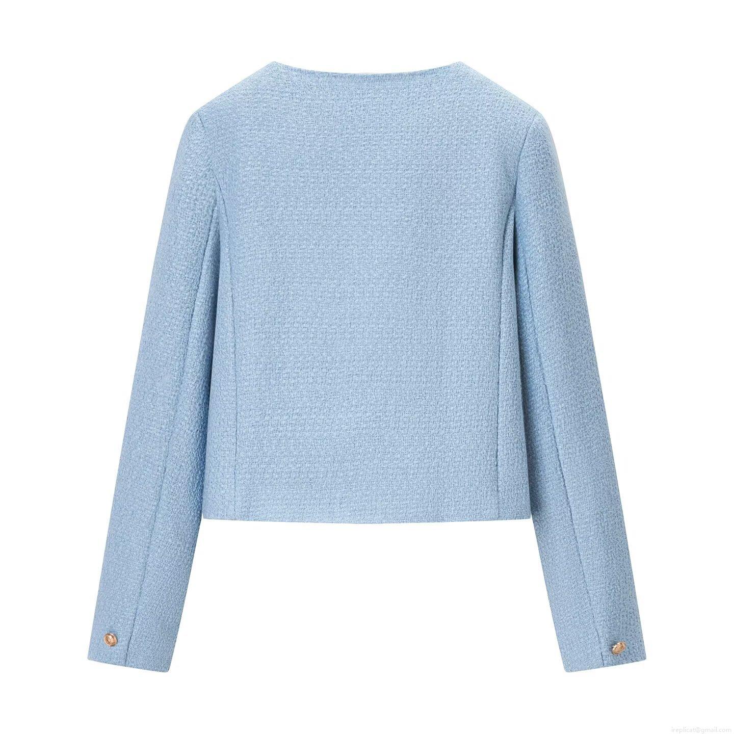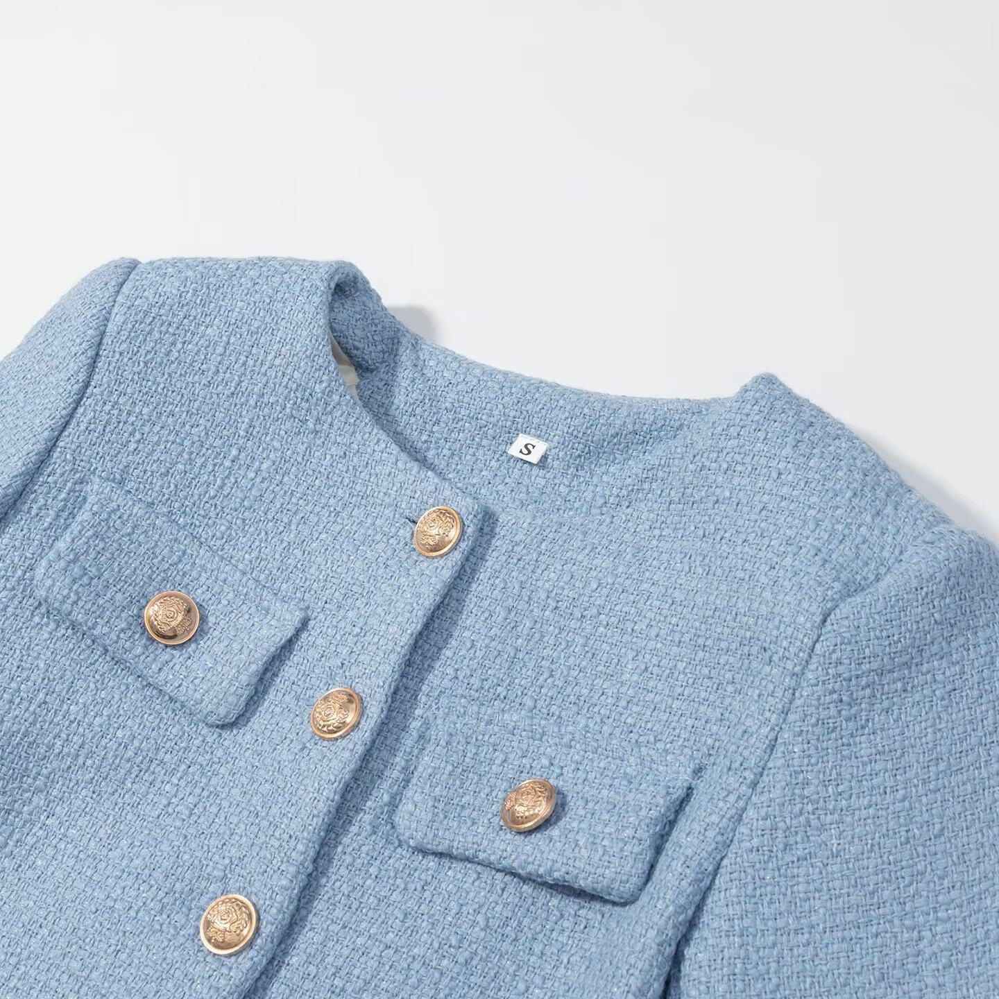 Women's Elegant Light Blue Tweed Jacket Round Neck Gold Button Long Sleeve Cropped Blazer Coat For Autumn Winter Daily Office Wear Street Style