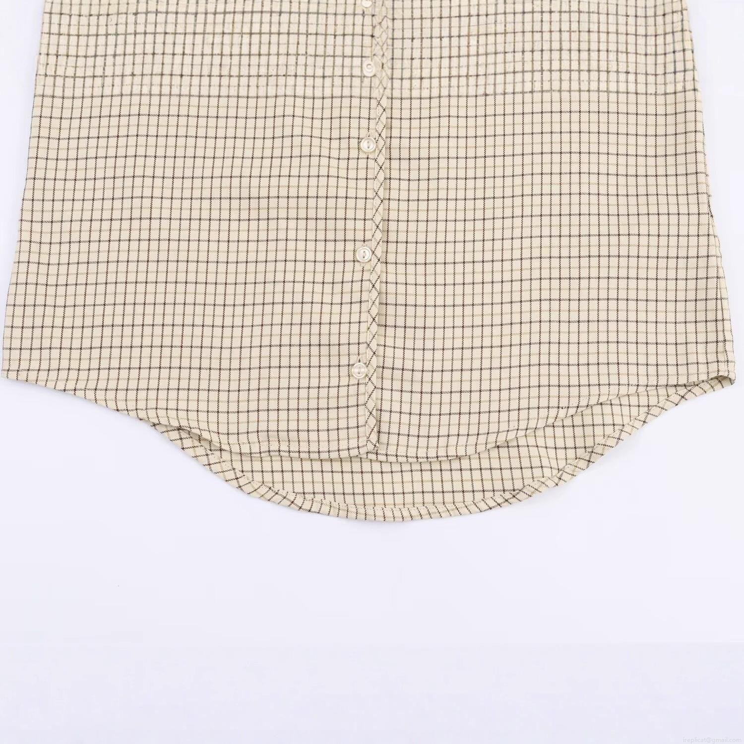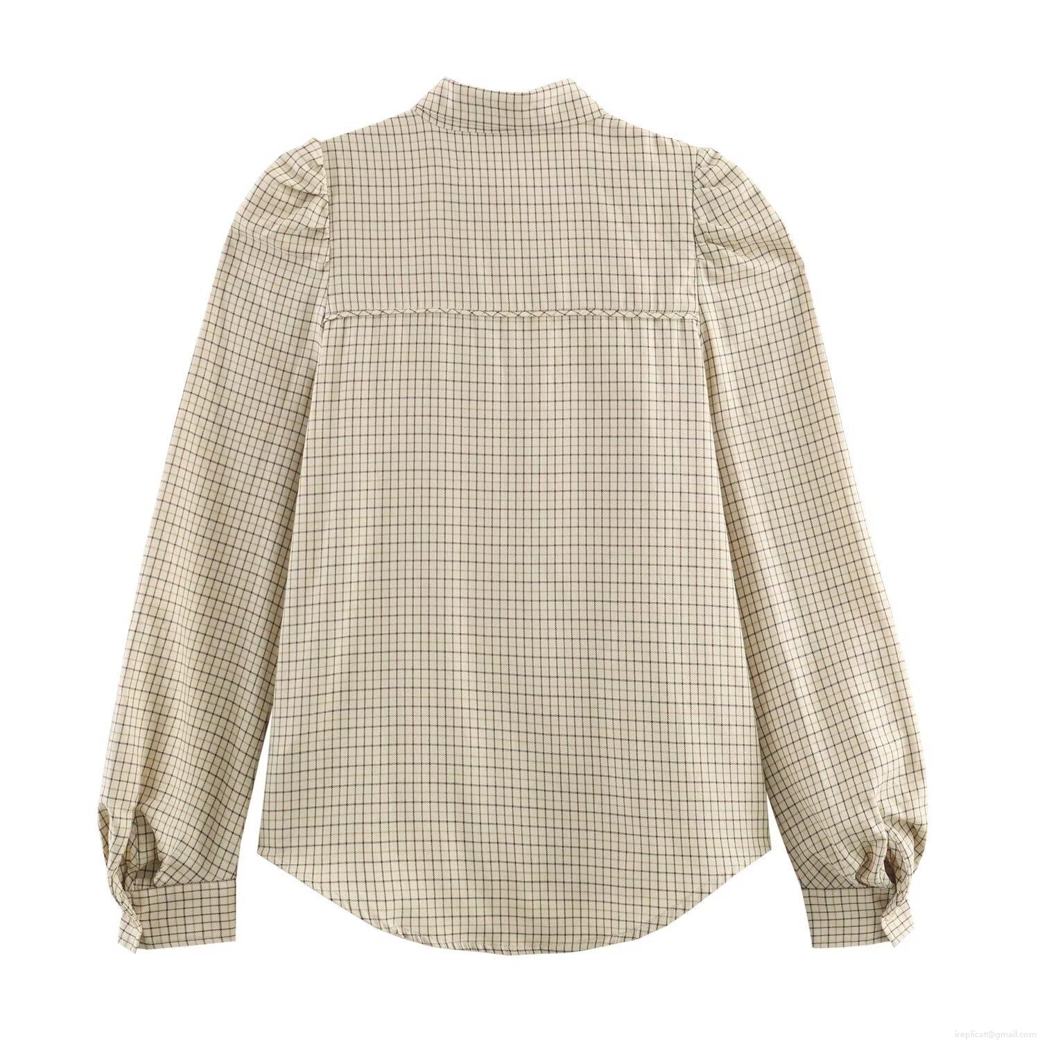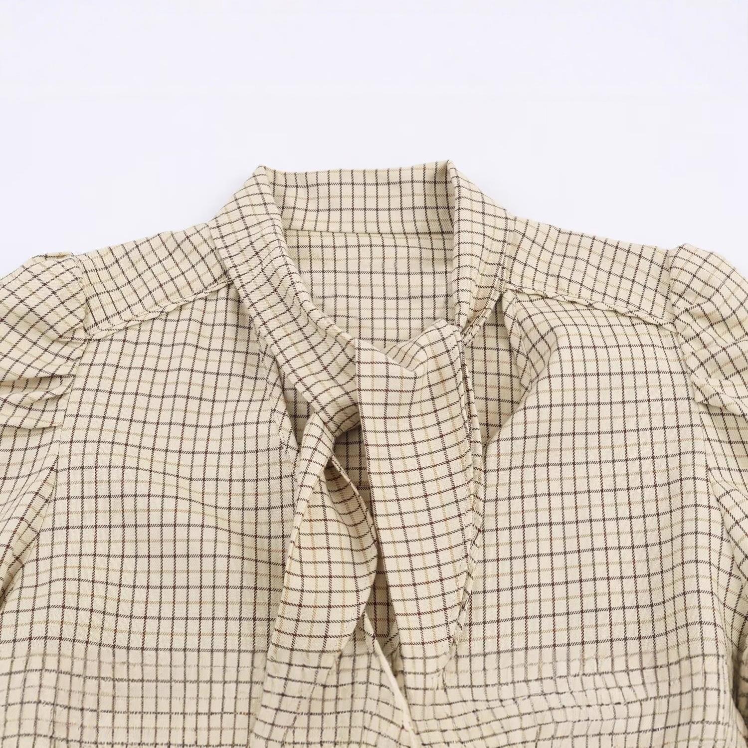 Women's Elegant Plaid Tie-Neck Long Sleeve Blouse Polyester Beige Check Button Down Shirt With Puff Sleeves For Autumn Winter Office Casual Streetwear