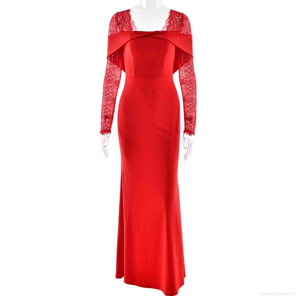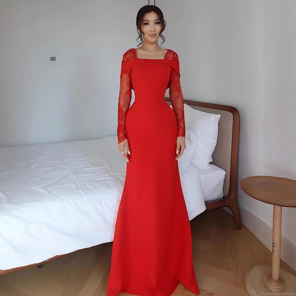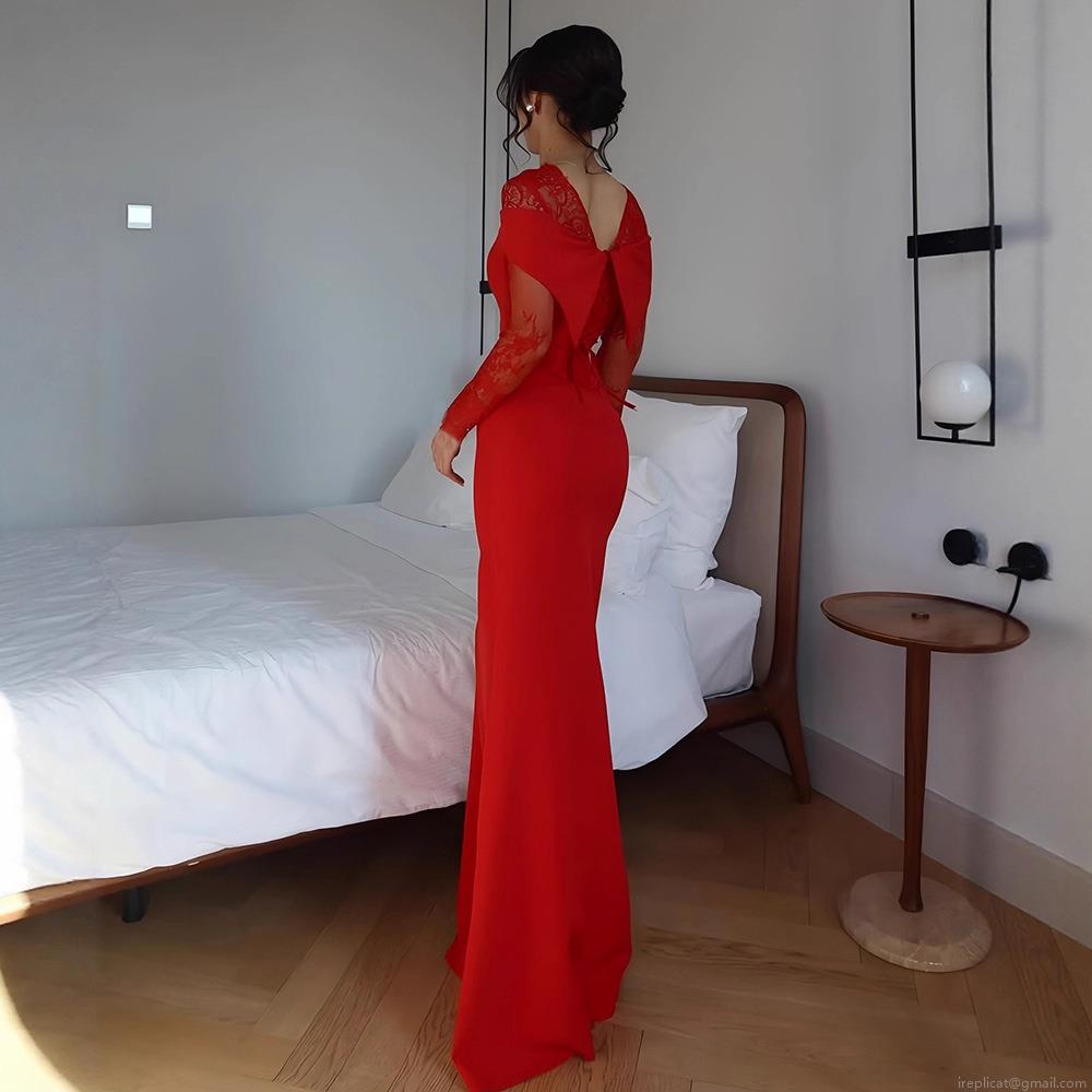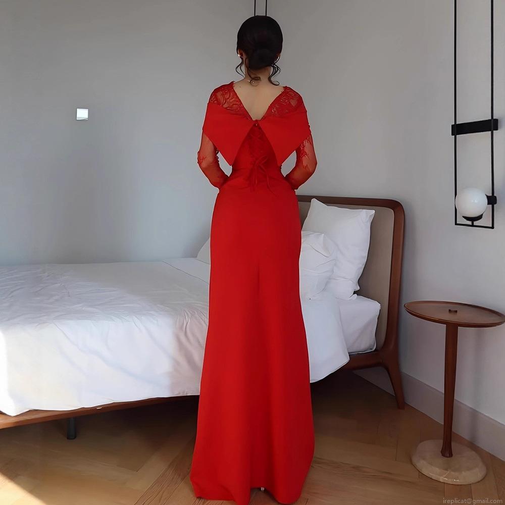 Women's Elegant Red Lace Patchwork Evening Dress Sexy Backless Bowknot Mermaid Long Gown For Wedding Party Formal Event Banquet Prom