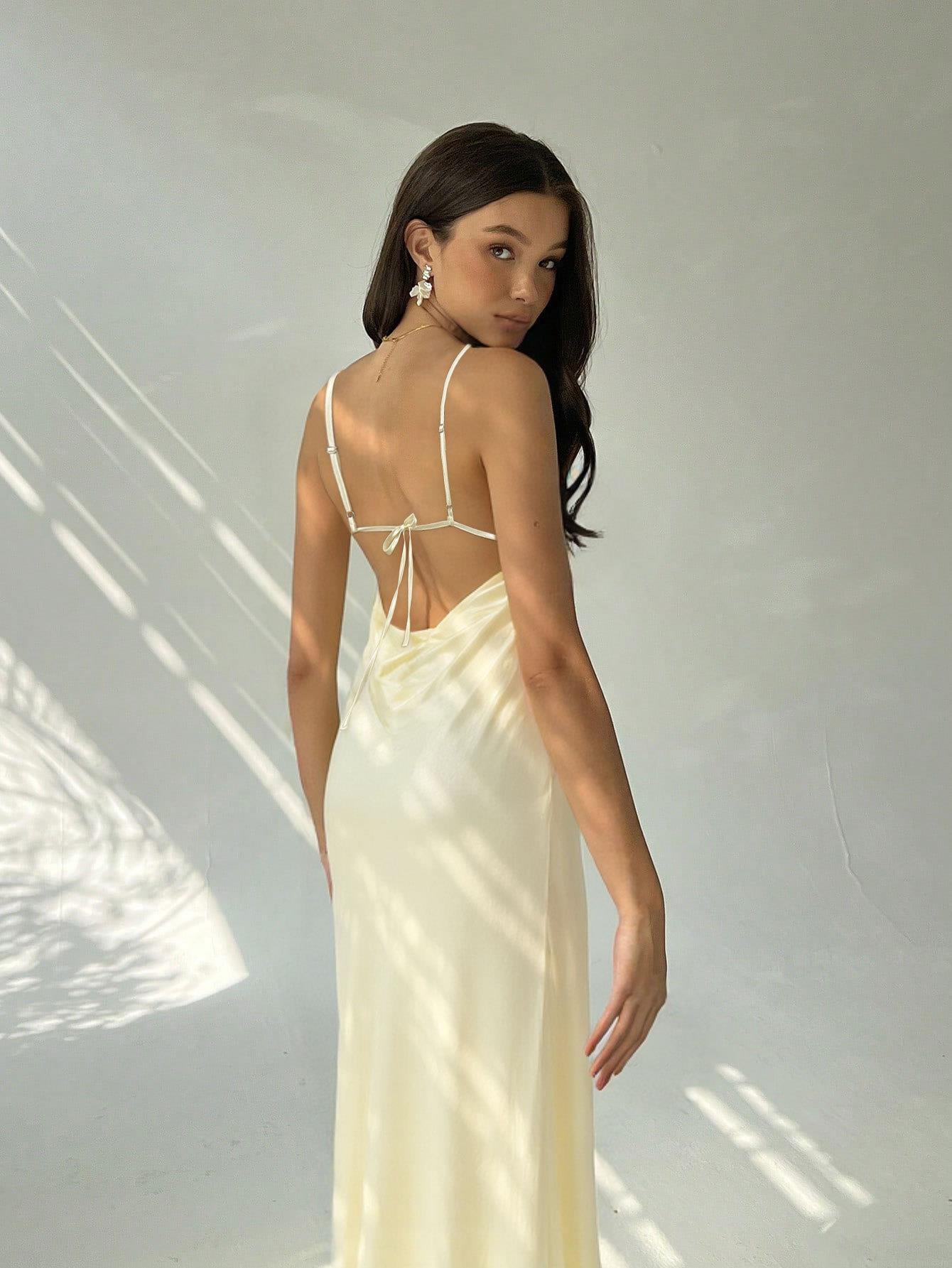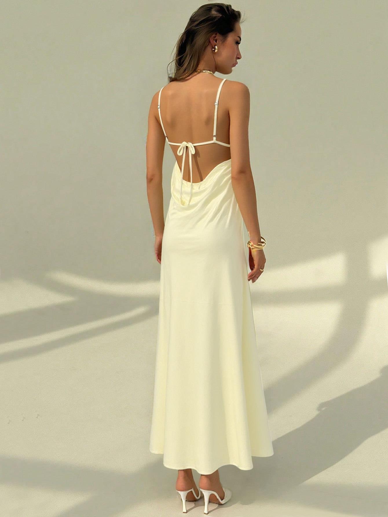 Solid Color, Pleats, Drawstring, V-neck, Backless, Thin Shoulder Straps
