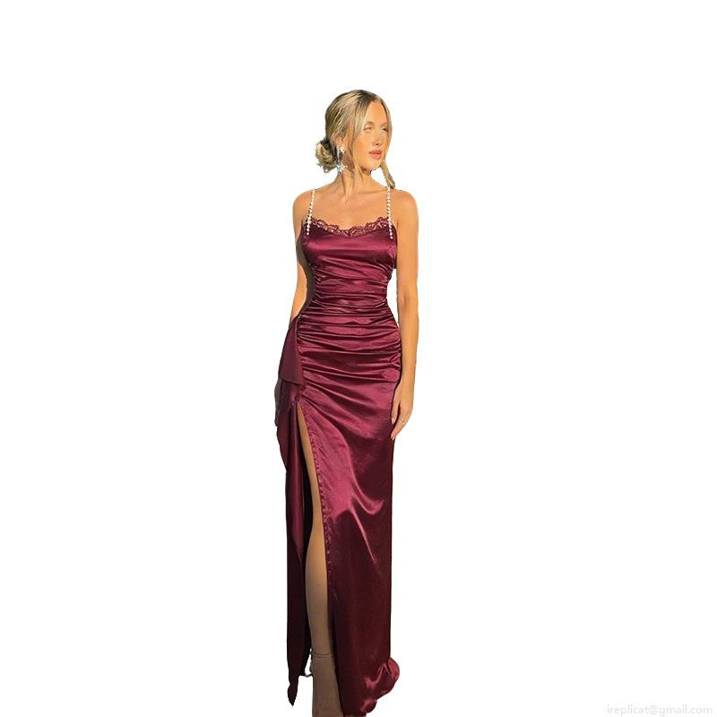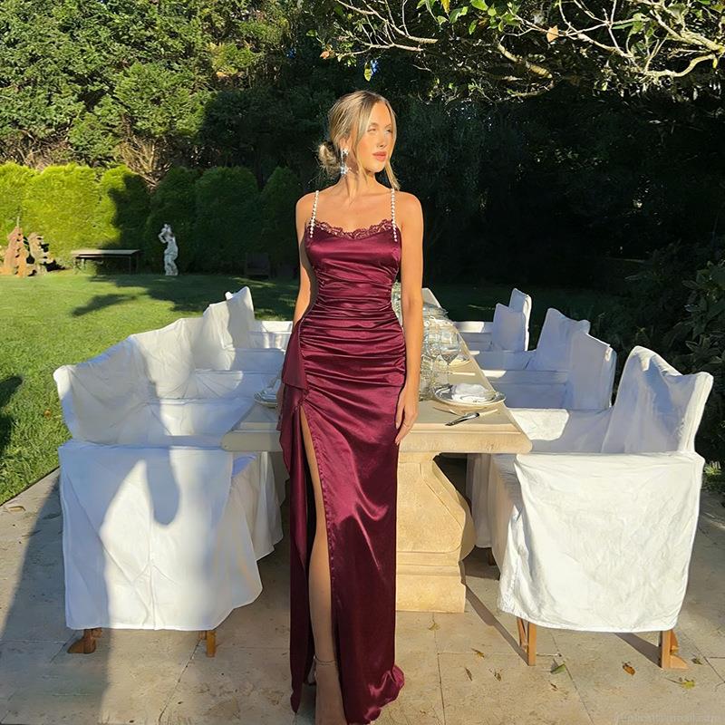 Women's Elegant Satin Evening Dress With Pearl Straps And Lace Trim Sexy Ruched High Slit Bodycon Maxi Party Dress For Wedding Prom