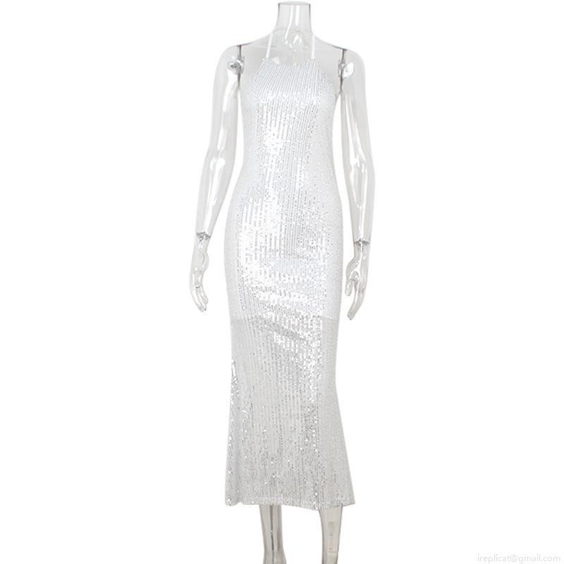 Women's Elegant Sequined Halter Evening Dress Sexy Backless Bodycon Fishtail Maxi Gown For Party Banquet Prom Wedding Guest Night Club Luxury Slim Fit Lady Outfits