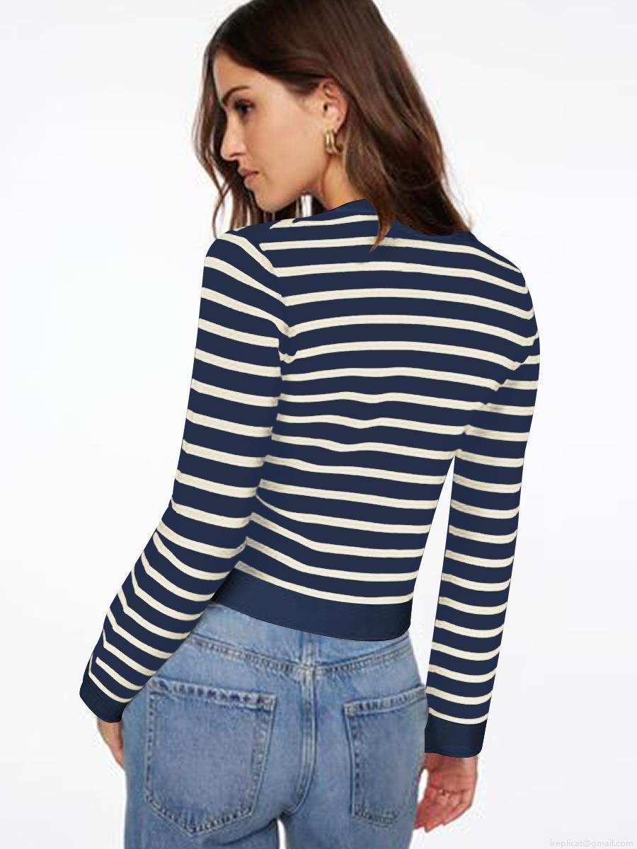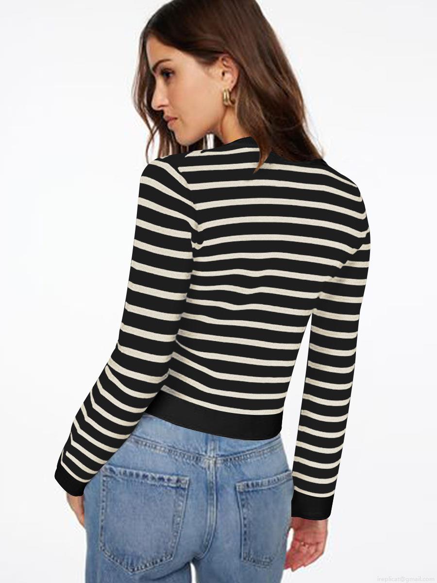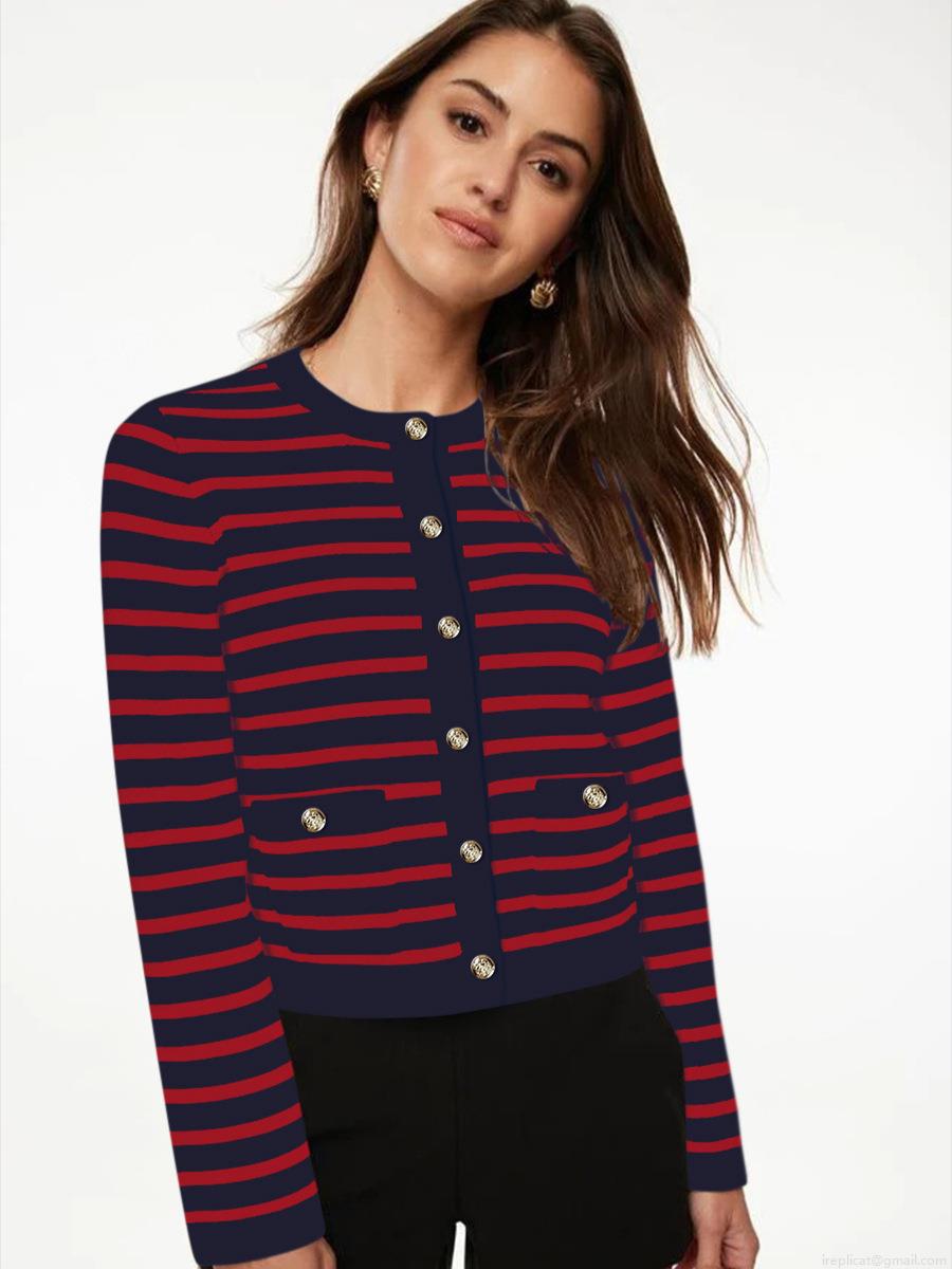 Women's Elegant Striped Knit Cardigan Slim Fit Short Jacket With Gold Metal Buttons Contrast Color Long Sleeve Cotton Blend Top For Daily Office Work
