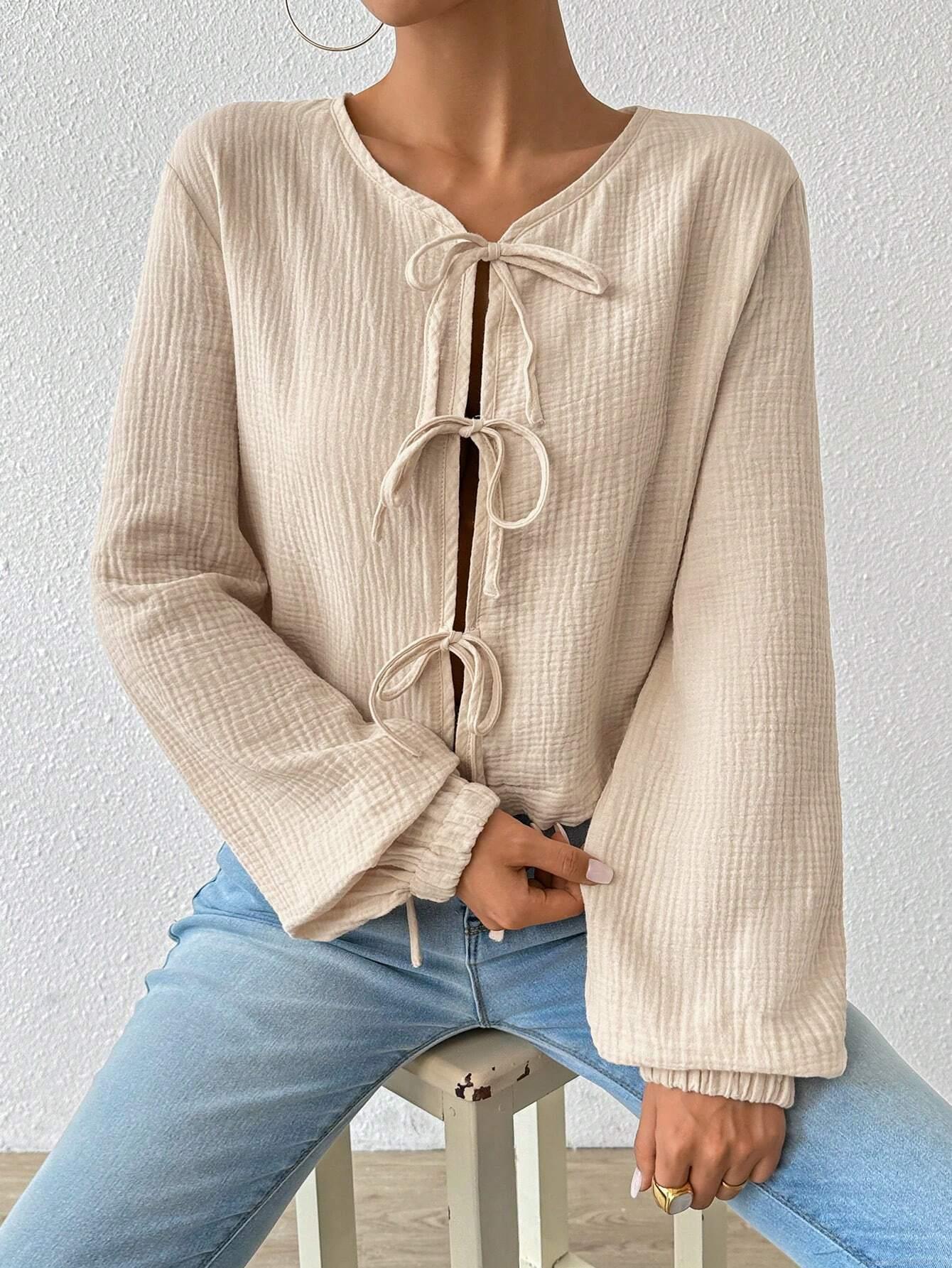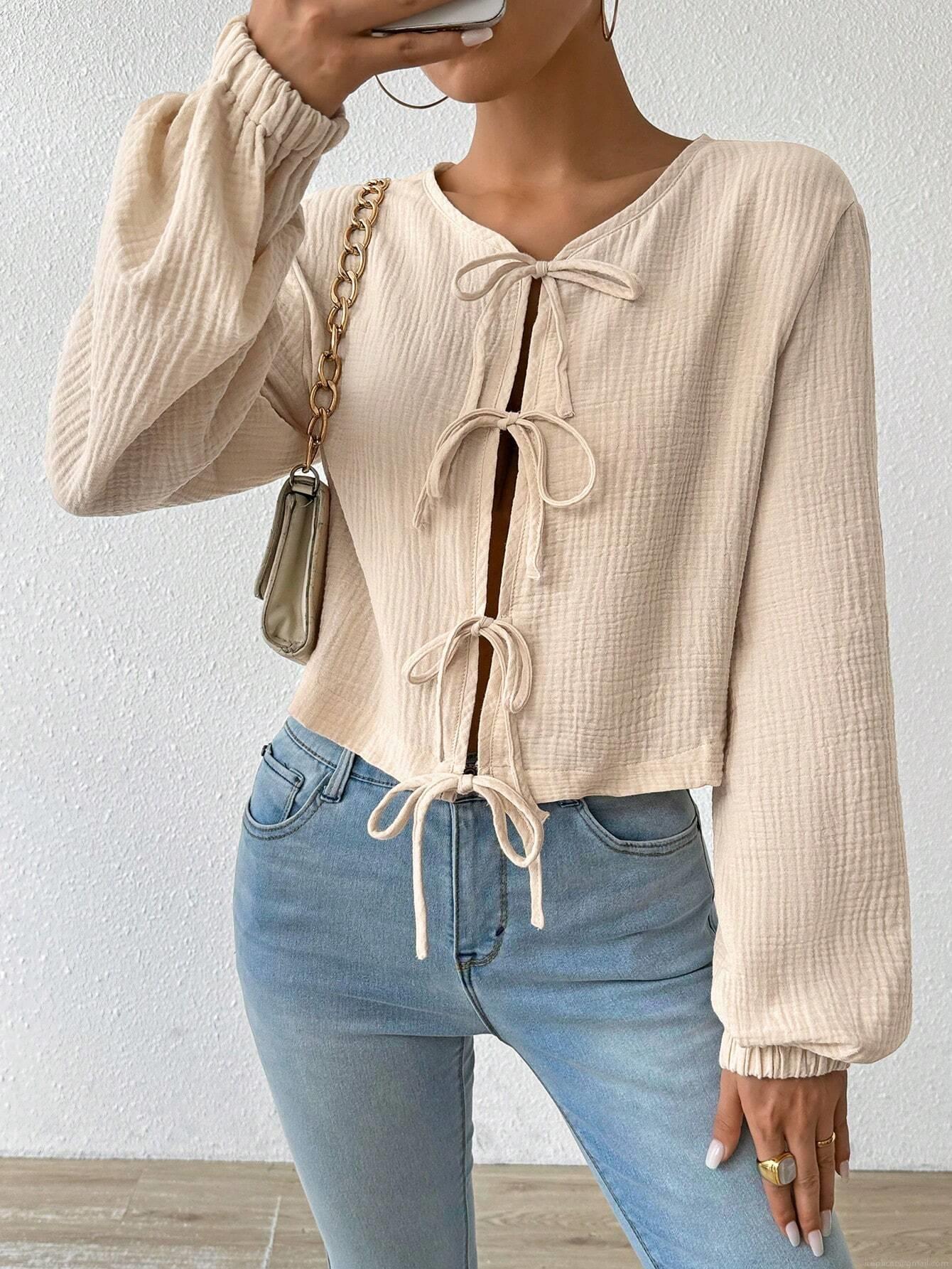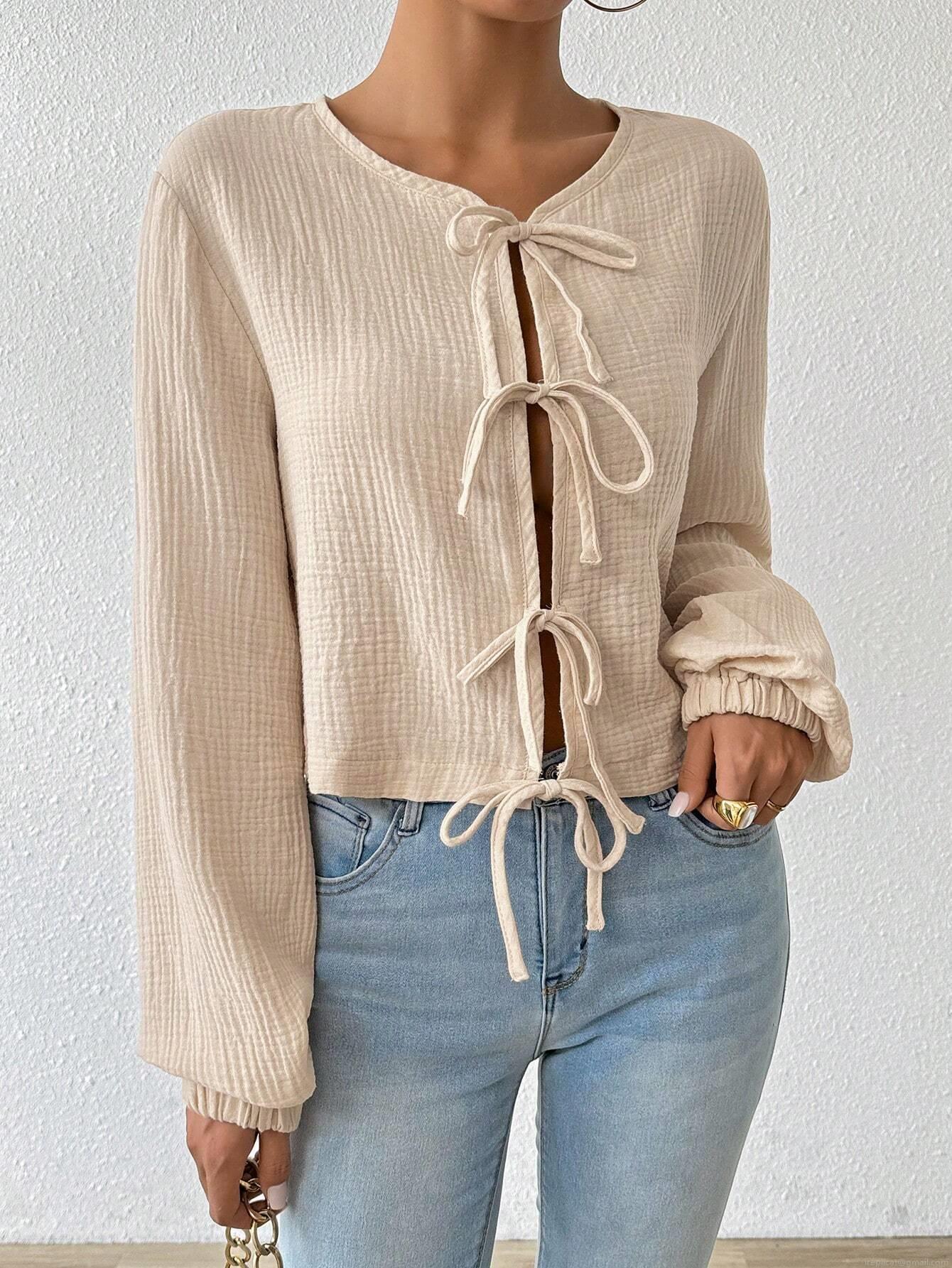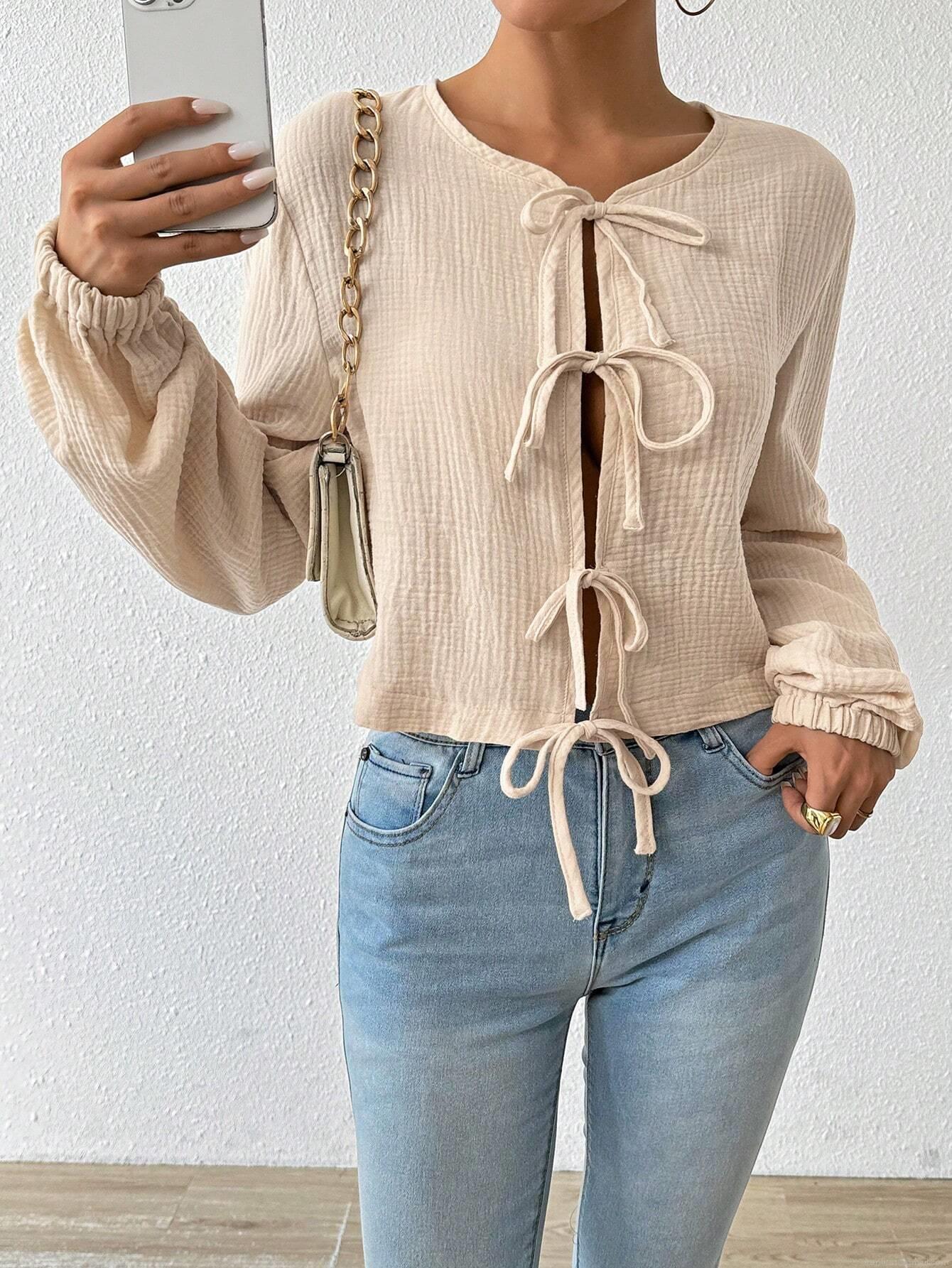 Women's Elegant Tie Front Cardigan Top 100% Cotton Pleated Crinkled Long Sleeve Lantern Blouse Casual Short Shirt For Women