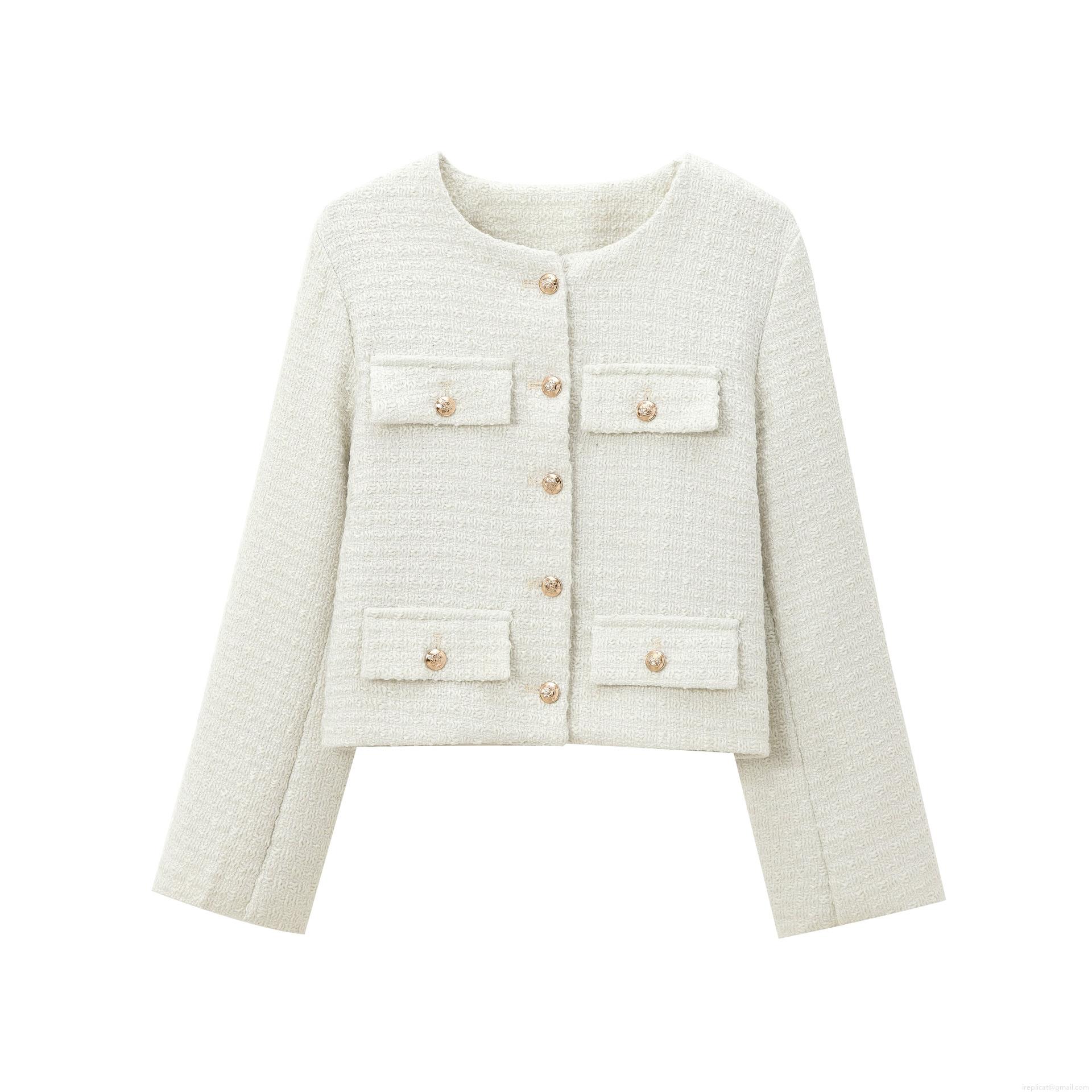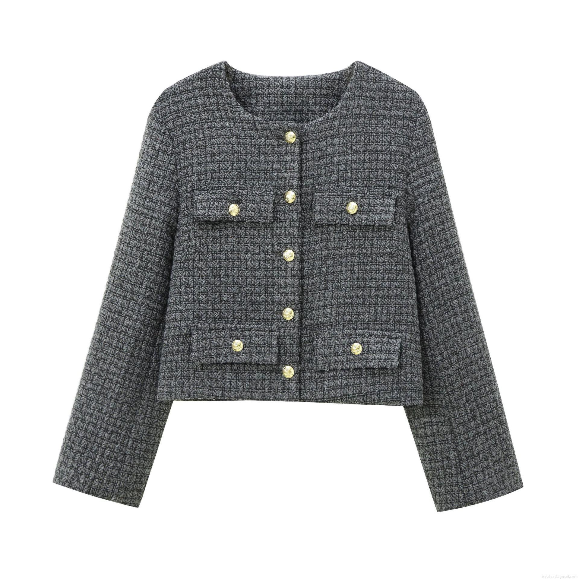 Women's Elegant Tweed Jacket Round Neck Long Sleeve Short Slim Fit Blazer With Gold Buttons Classic Autumn Winter Outerwear For Office Party Lady Coat