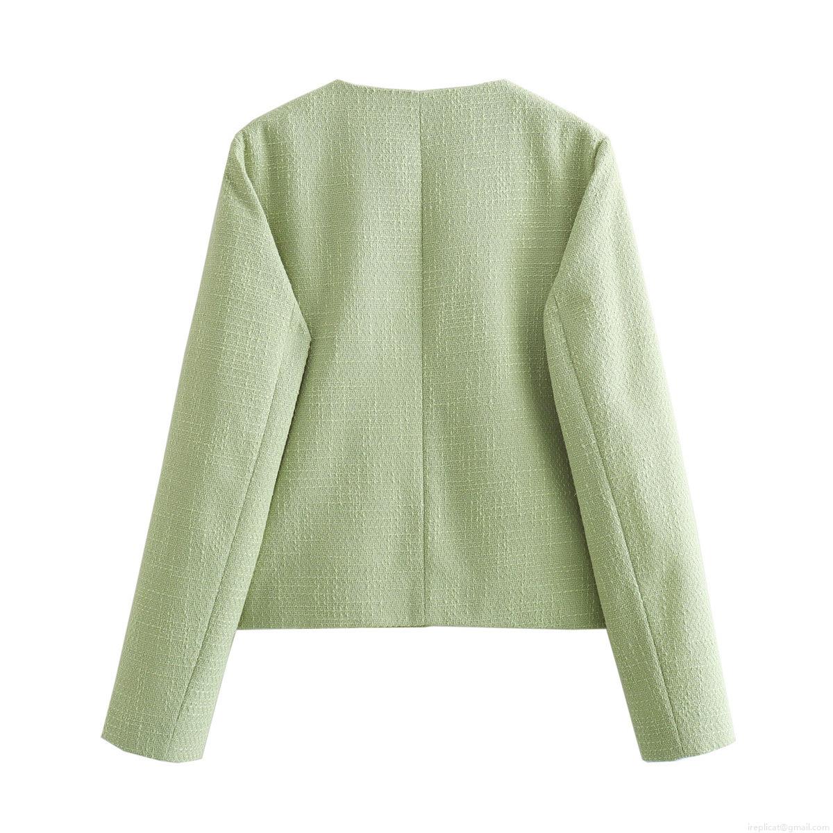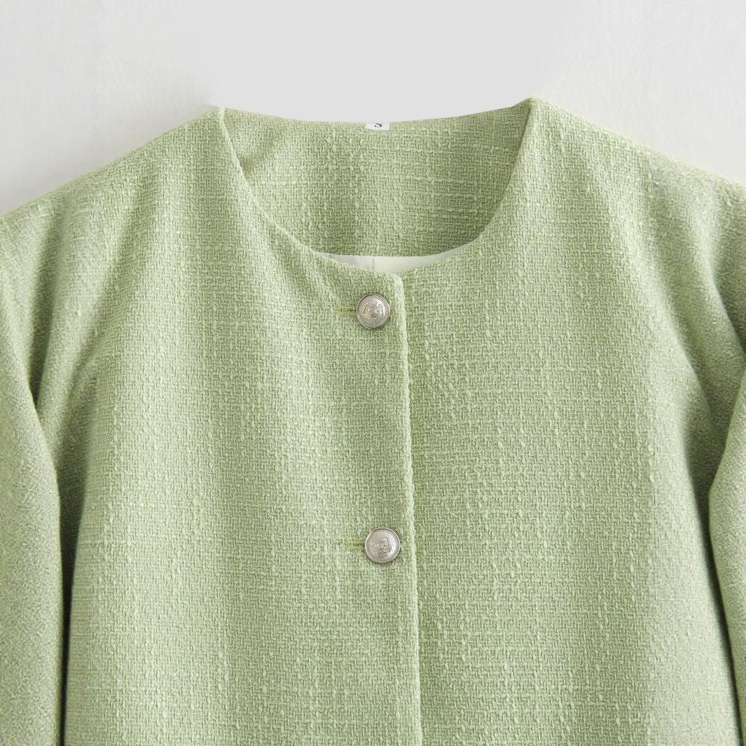 Women's Elegant Tweed Jacket Short Crop Coat Light Green Crew Neck Long Sleeve Single Breasted Outerwear With Metal Buttons For Daily Work Lady Autumn Spring Fashion Jacket