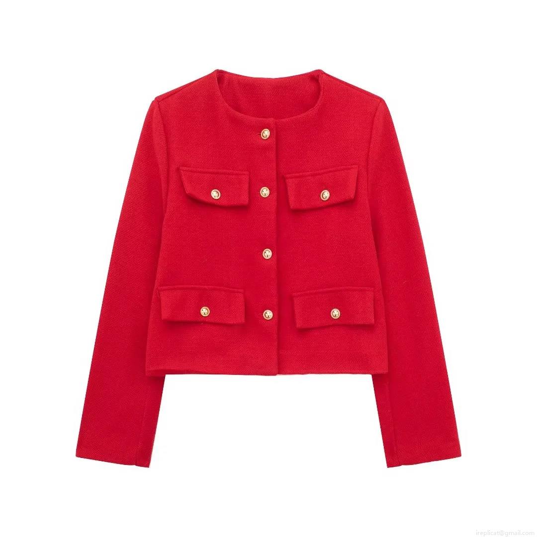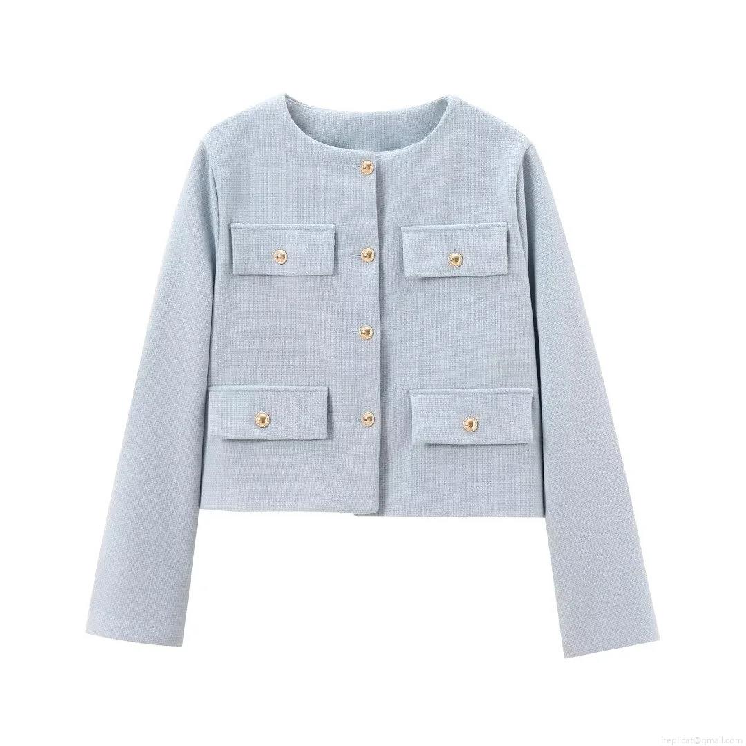 Women's Elegant Tweed Jacket Short Cropped Coat Round Neck Gold Buttons Four Pockets Casual Outwear For Autumn Winter Fashion