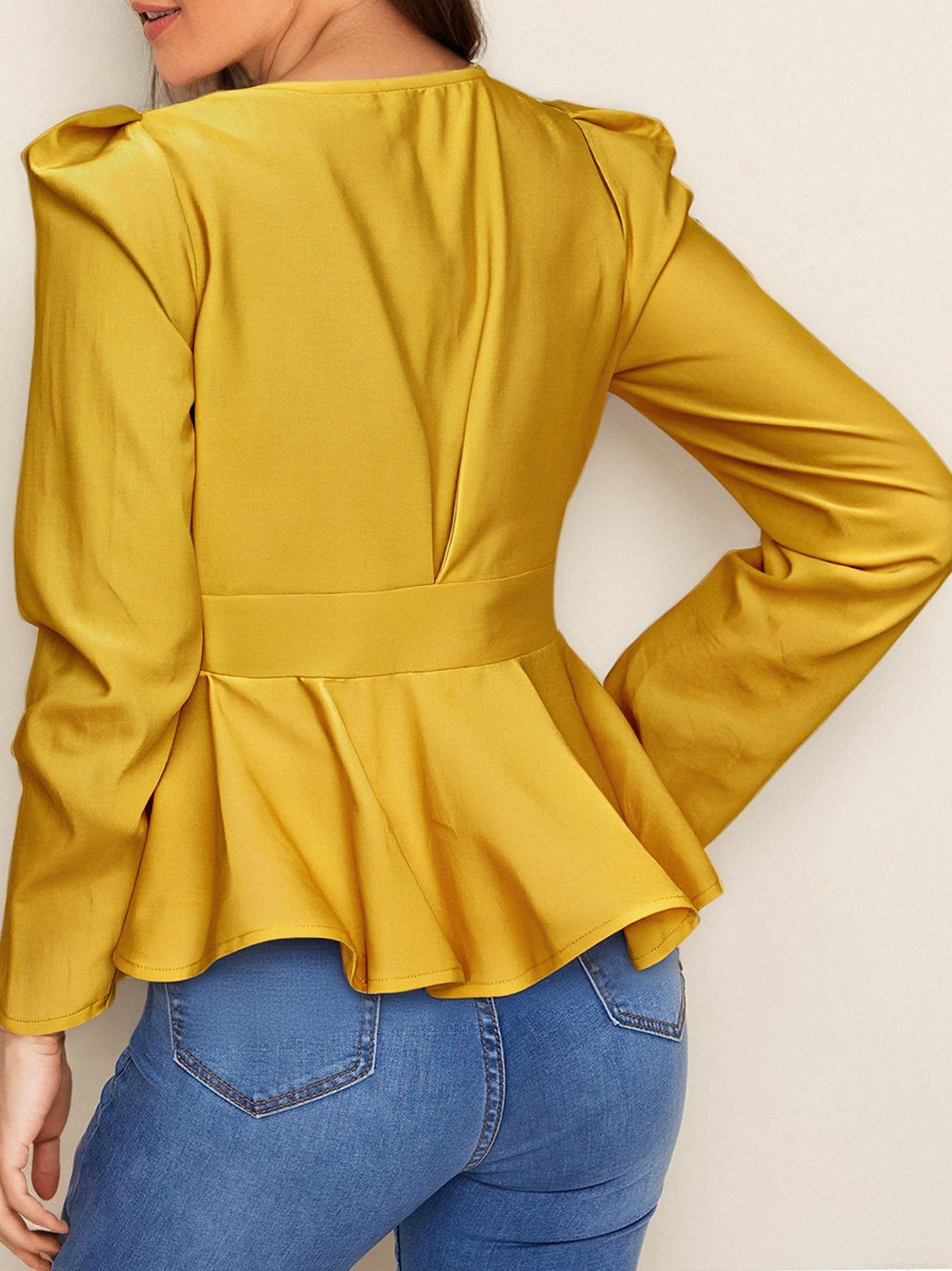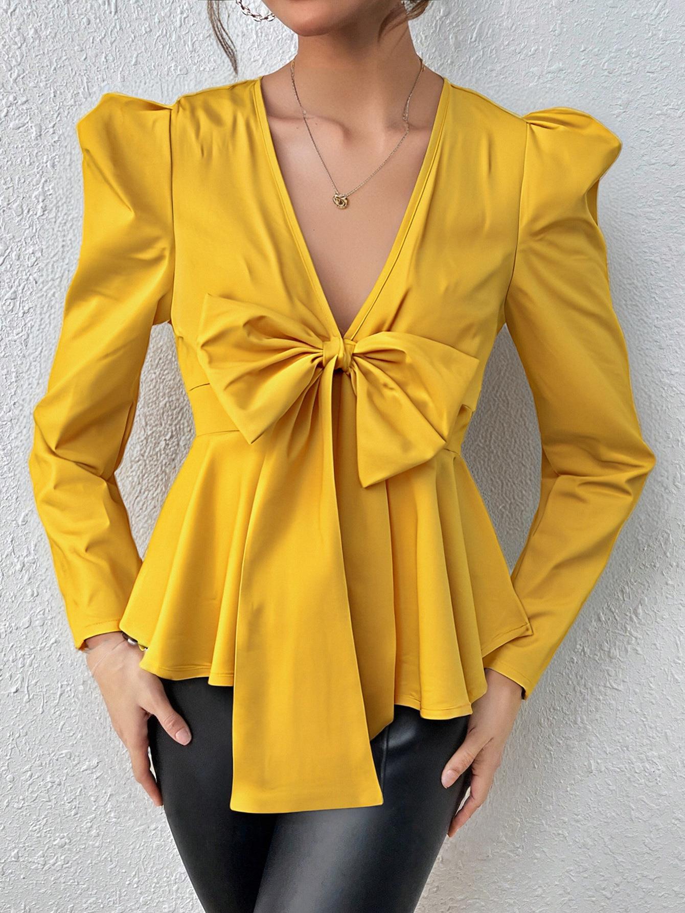 Women's Elegant V Neck Long Sleeve T-Shirt With Big Bow Ruffle Hem Satin Texture Puff Sleeve Casual Blouse Top For Ladies Party Office