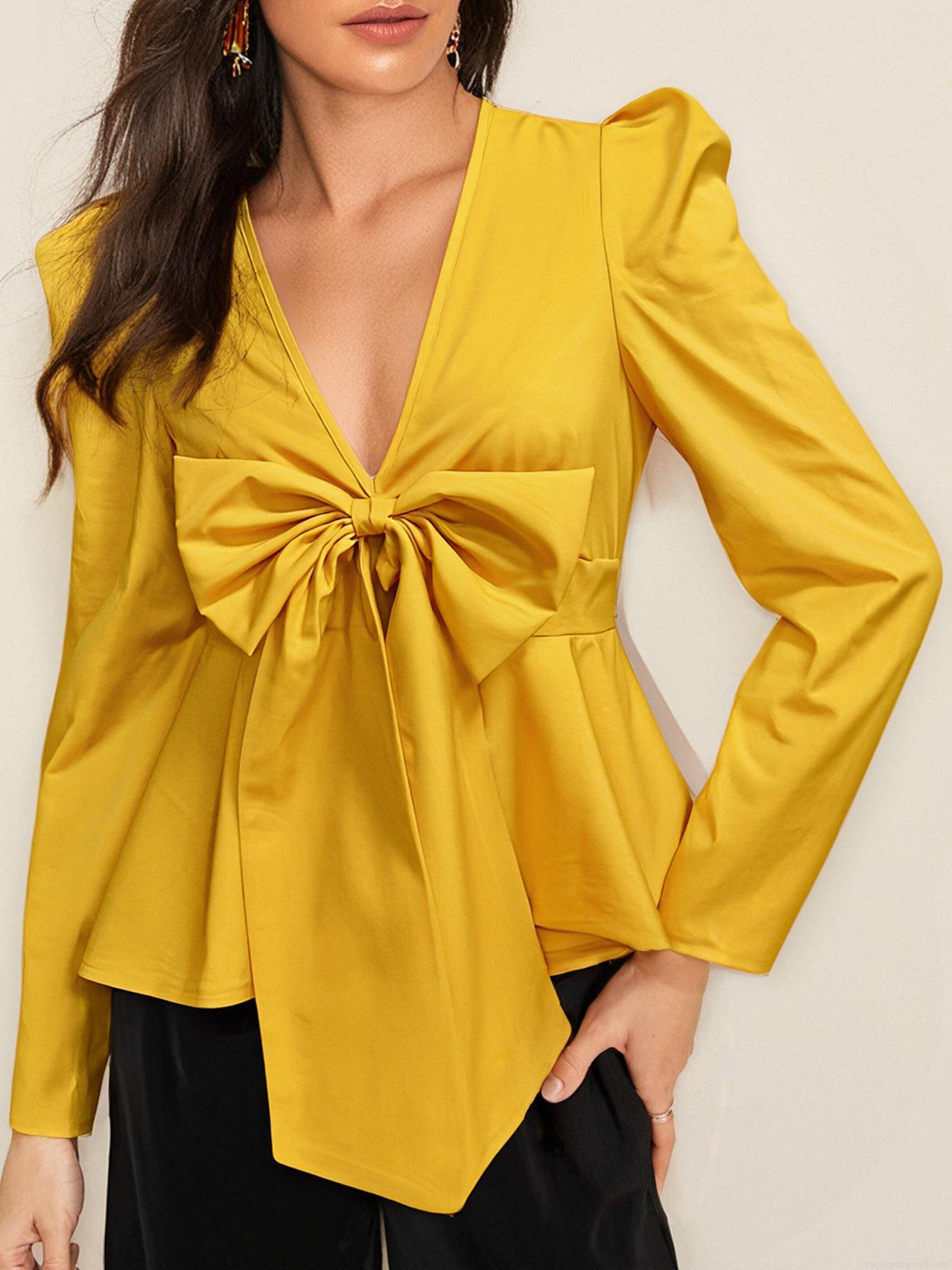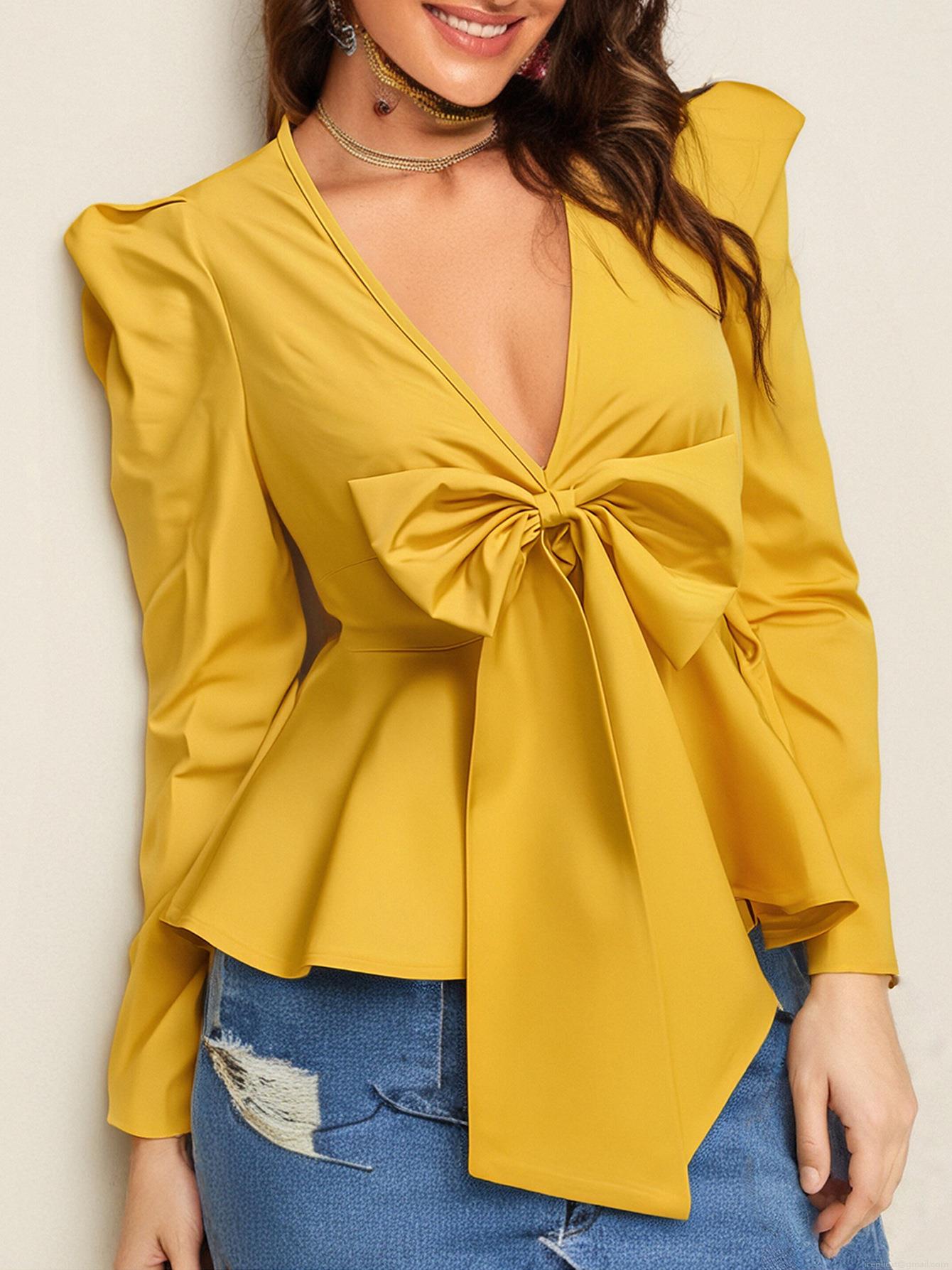Solid Color, Big Bow, V-neck, Puff Sleeves, Pleated Decoration, Ruffled Hem