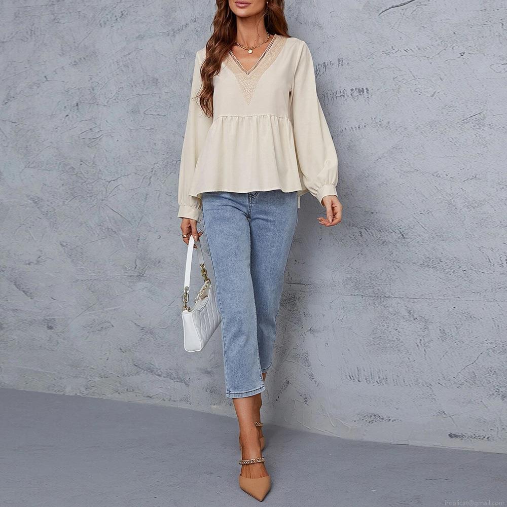 Women's Elegant V-Neck Lace Splicing Long Sleeve Blouse Lightweight Polyester Peplum Hem Pullover Shirt for Office Daily Wear Ivory White Top