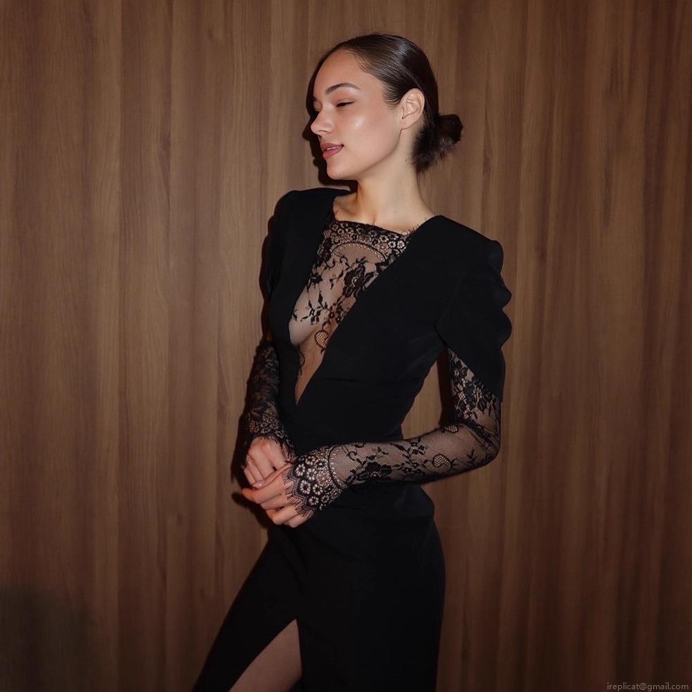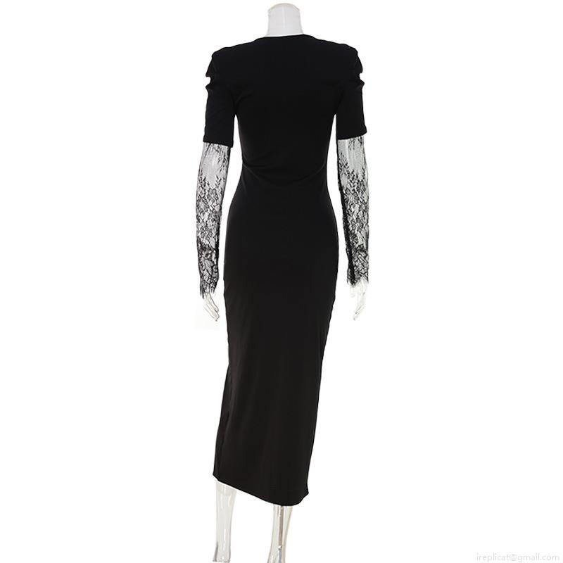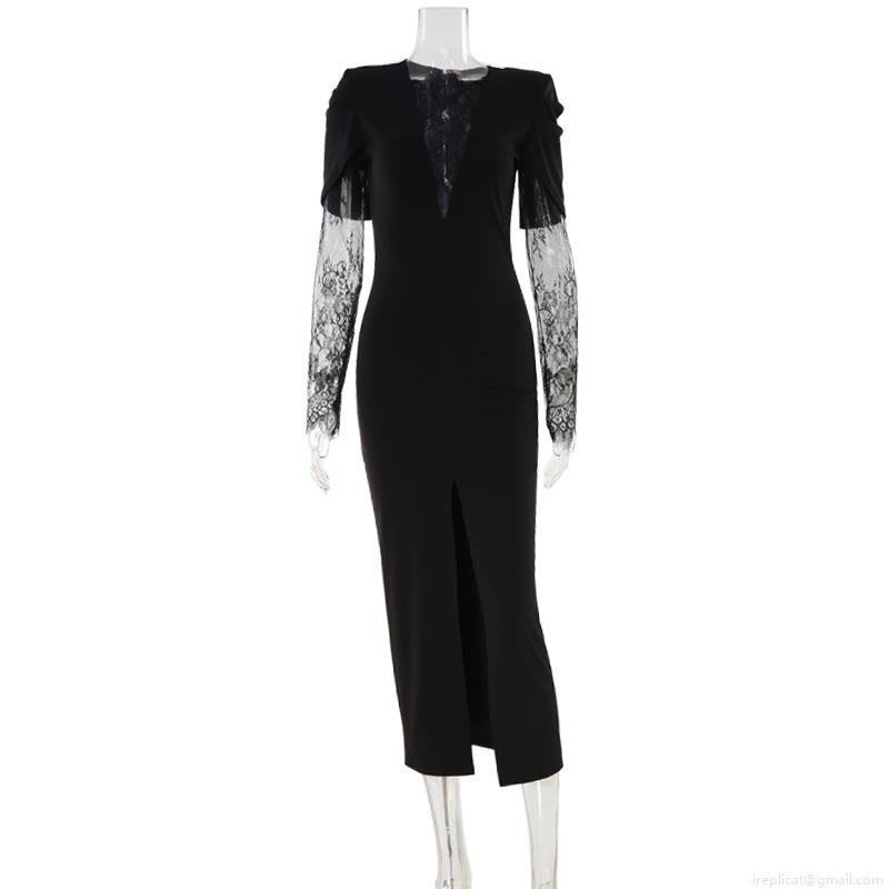 Women's Elegant V-Neck Long Sleeve Dress With Black Lace Patchwork High Slit Slim Fit Bodycon Evening Party Long Midi Dress For Autumn Winter