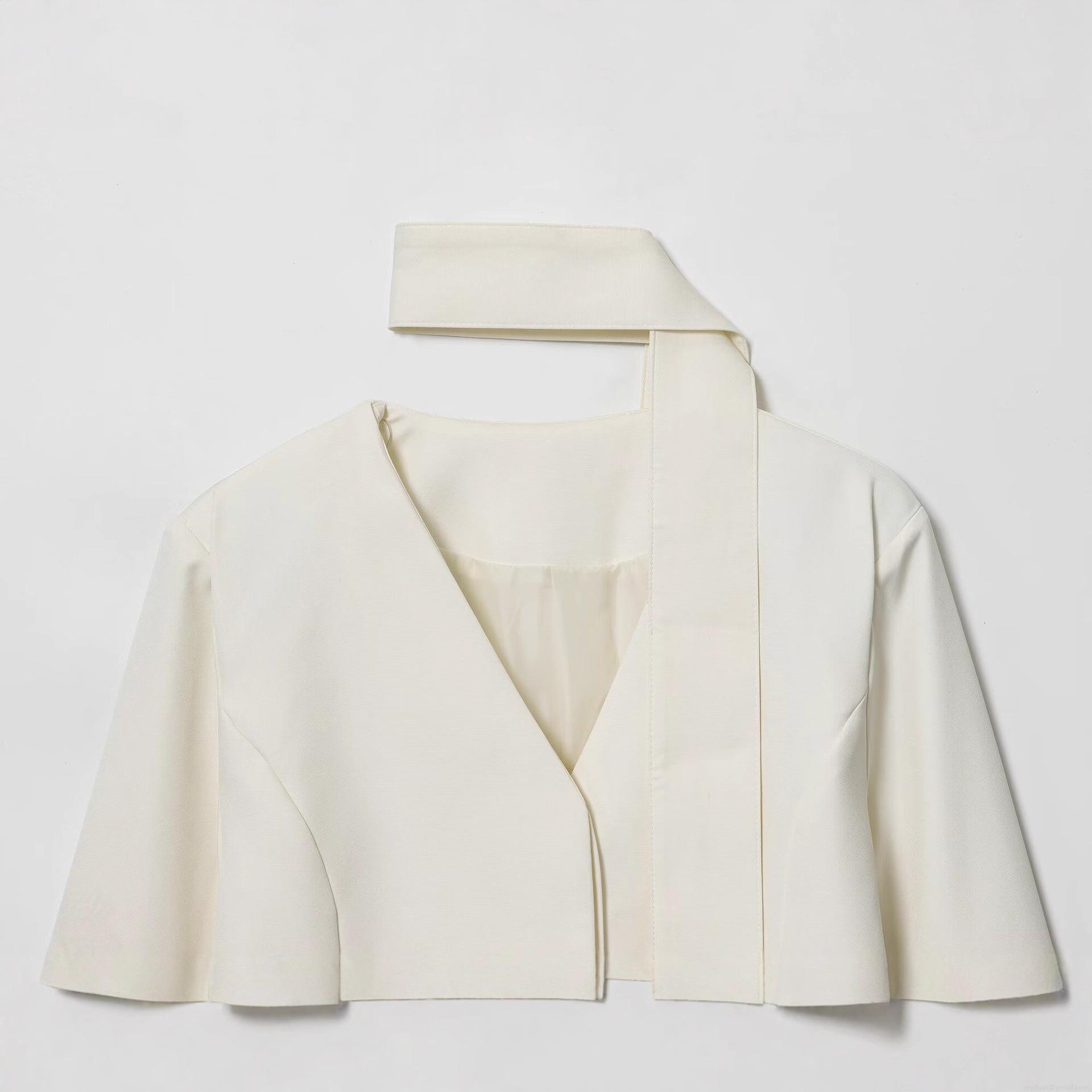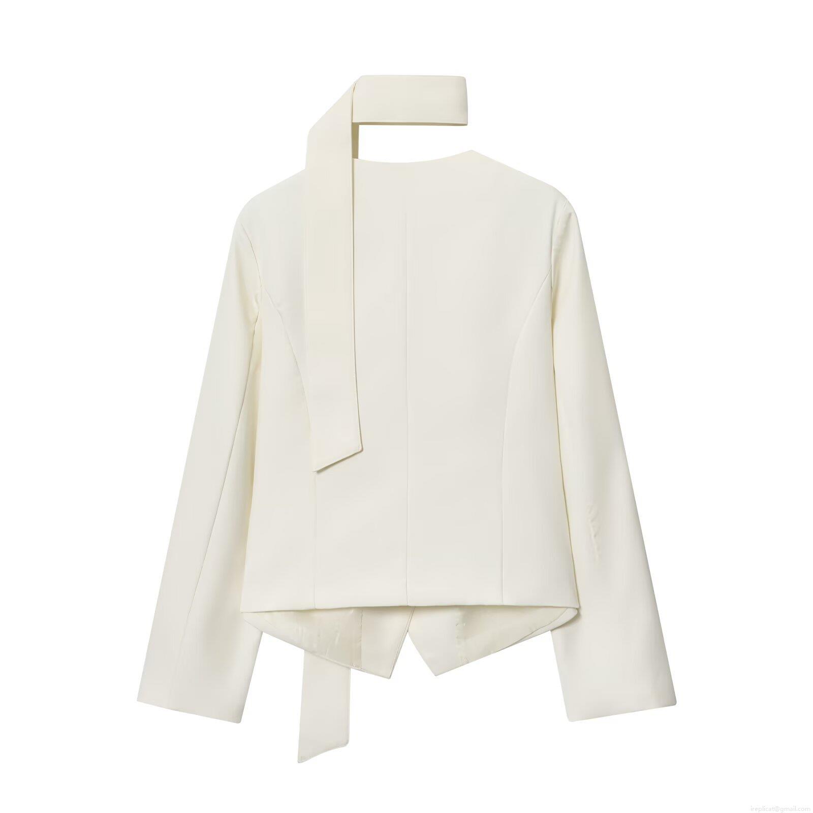 Women's Elegant White V-Neck Blazer Jacket with Matching Scarf Necktie Decoration Minimalist Autumn Long Sleeve Single Breasted Suit Outerwear for Office Lady