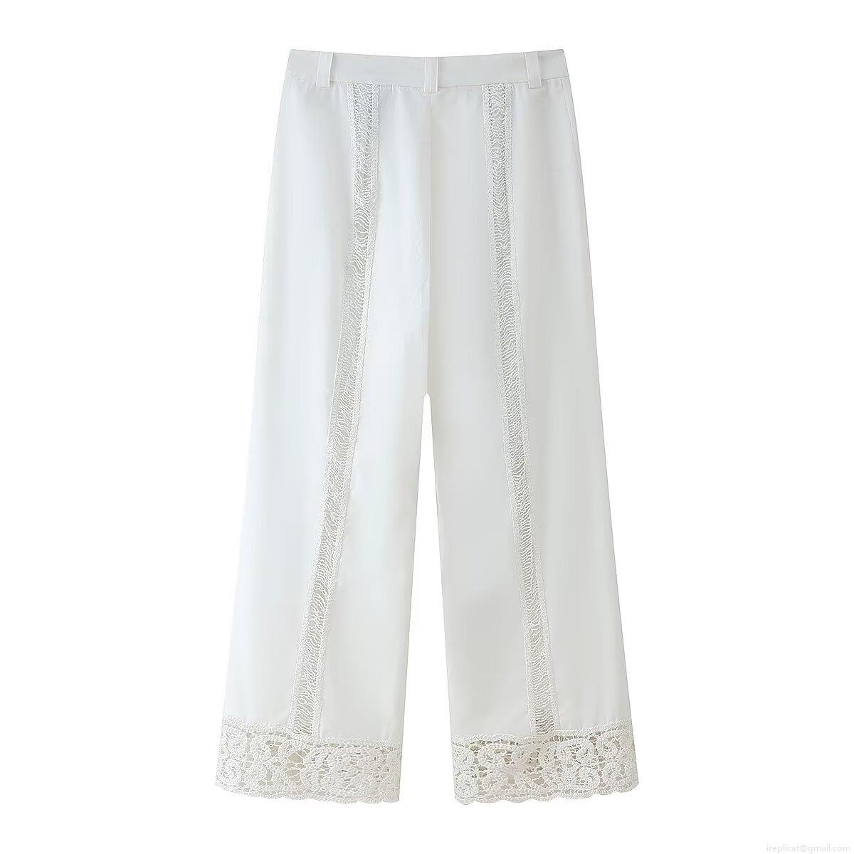 Women's Elegant Wide Leg Pants With Hollow Lace Splicing High Waist Straight Trousers Solid White Polyester Long Pants For Casual Dating Party Ladies Sweet Streetwear