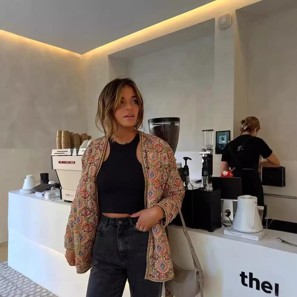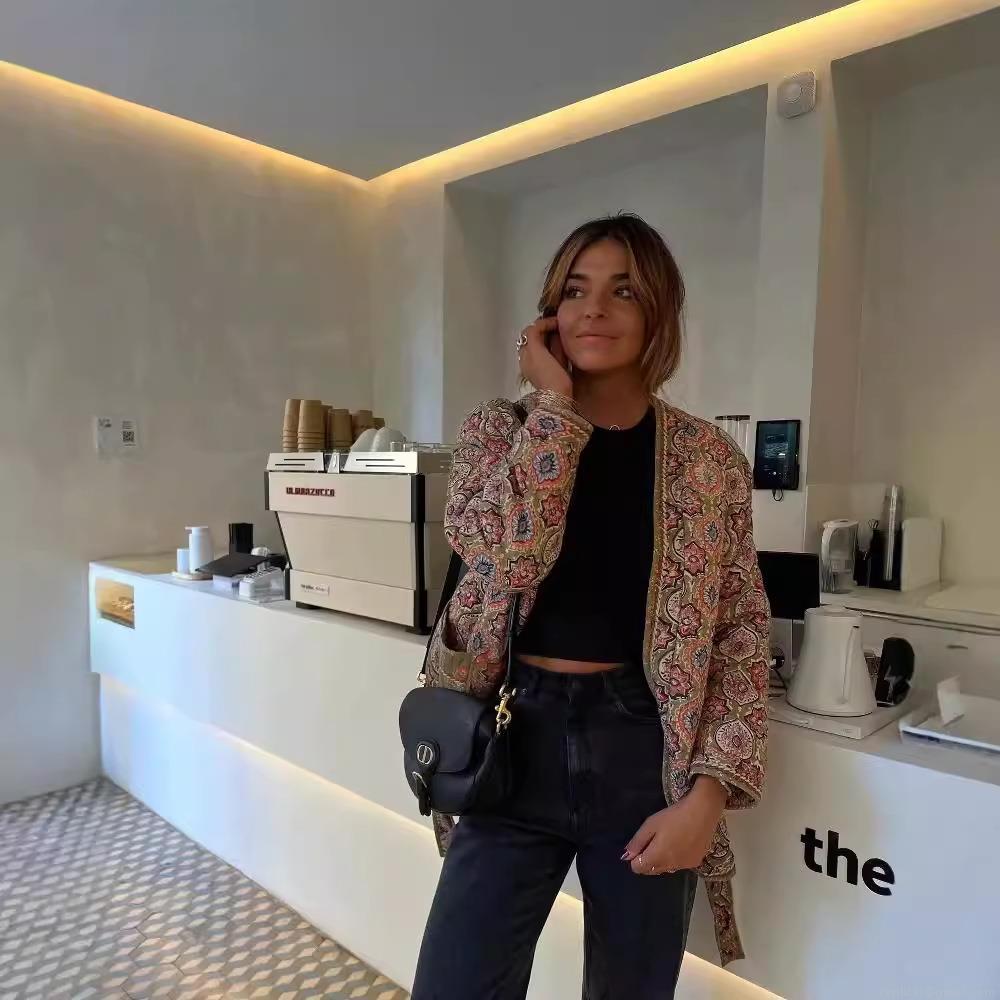 Women's Ethnic Floral Print Quilted Jacket Long Sleeve Mid-Length Belted Coat With Pockets Bohemian Retro Style 100% Polyester Outerwear Fall Winter