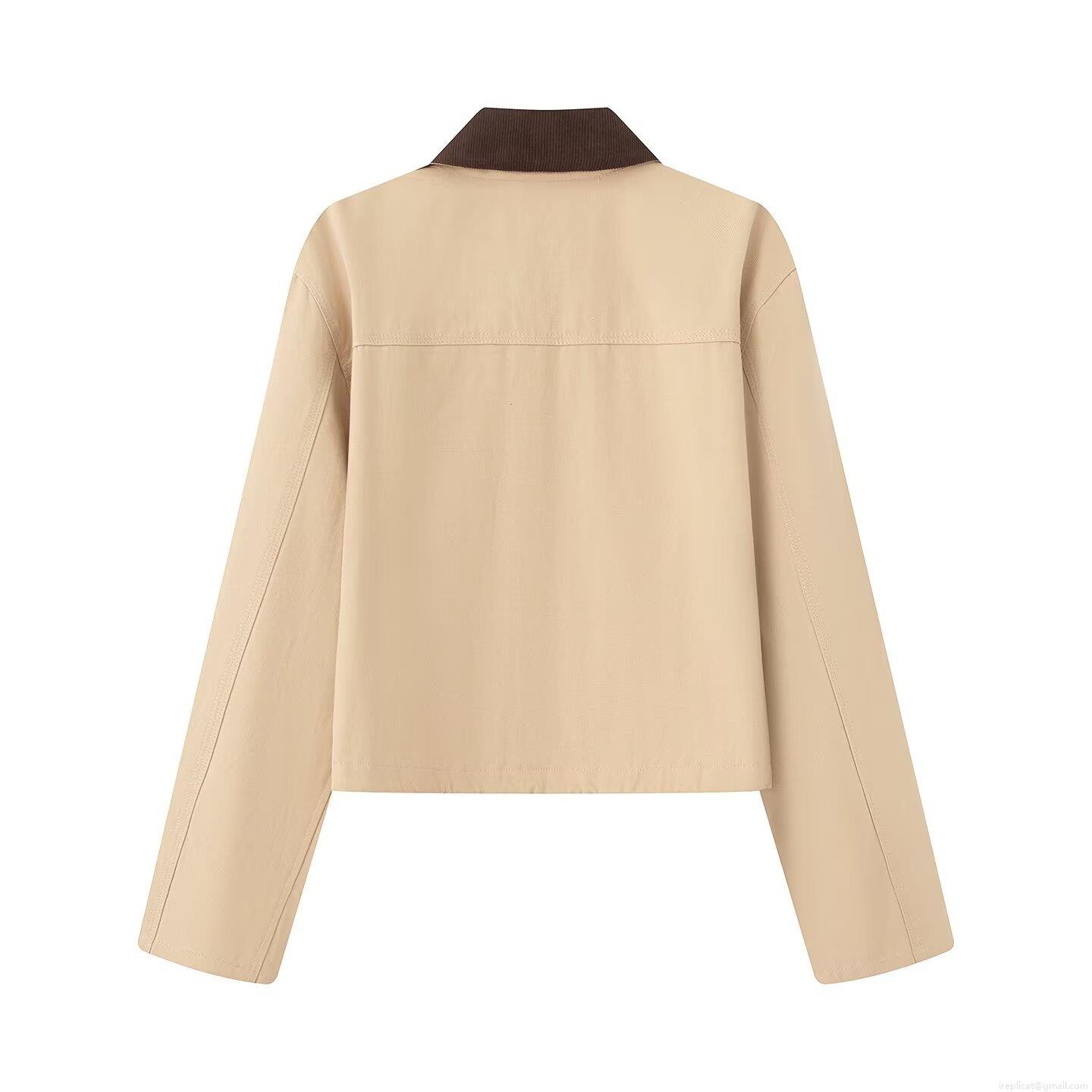 Women's Retro Khaki Canvas Jacket With Black PU Leather Lapel Collar...