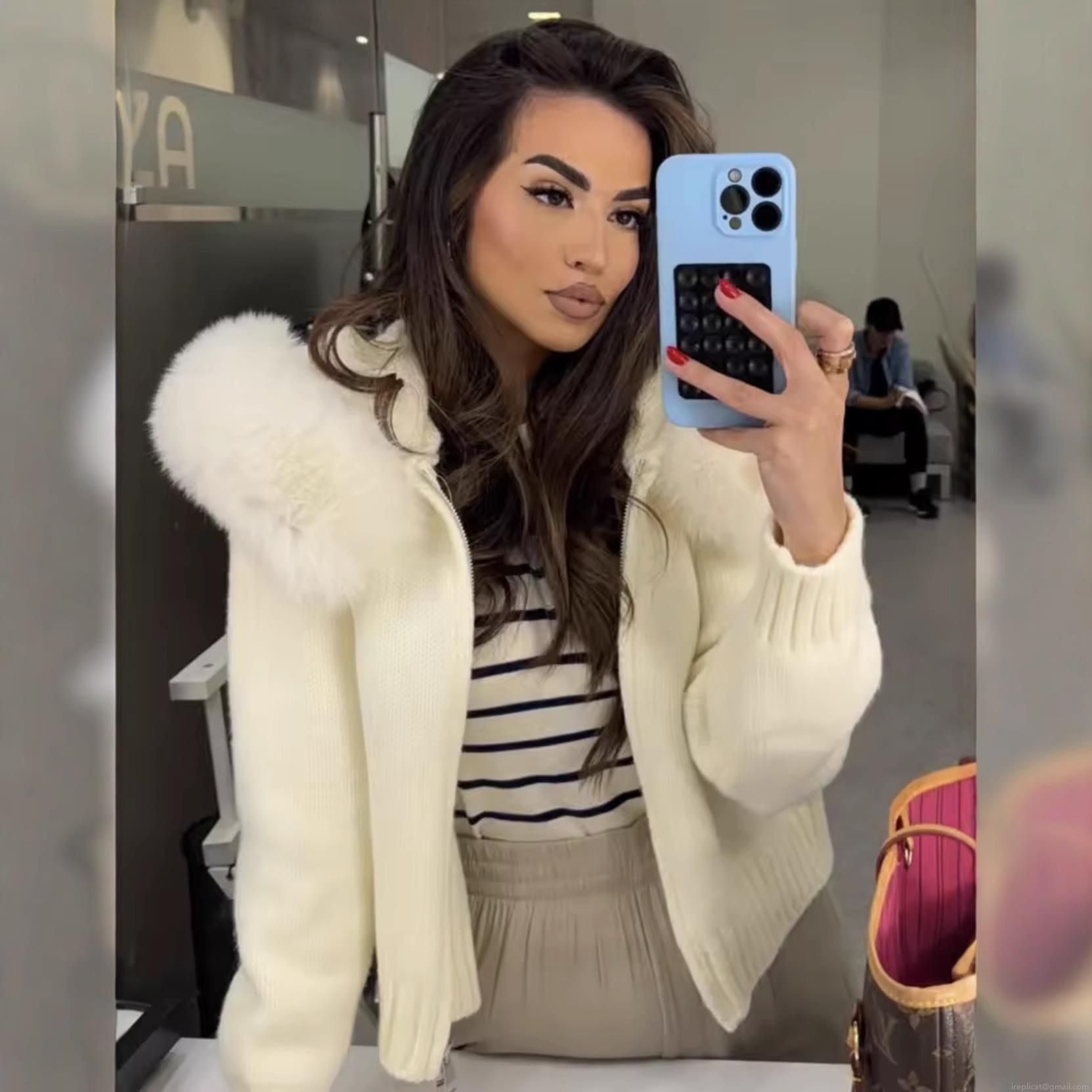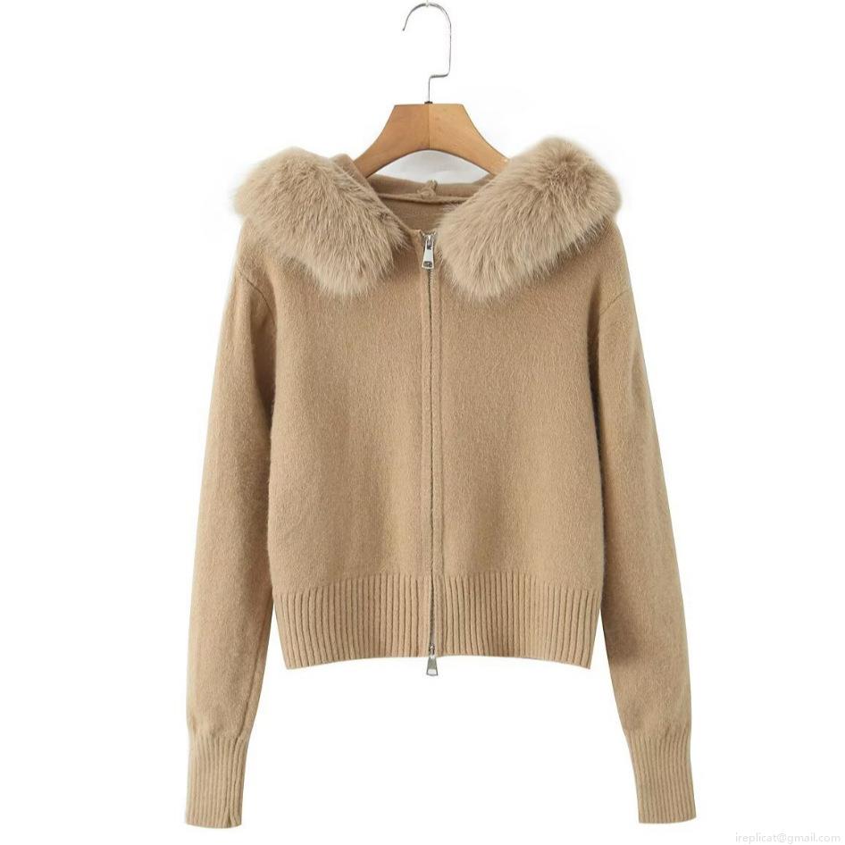 Women's Fashion Casual Knit Cardigan With Faux Fur Collar Hooded Metal Zipper Long Sleeve Warm Sweater Coat For Autumn Winter Solid Color Elegant Outerwear