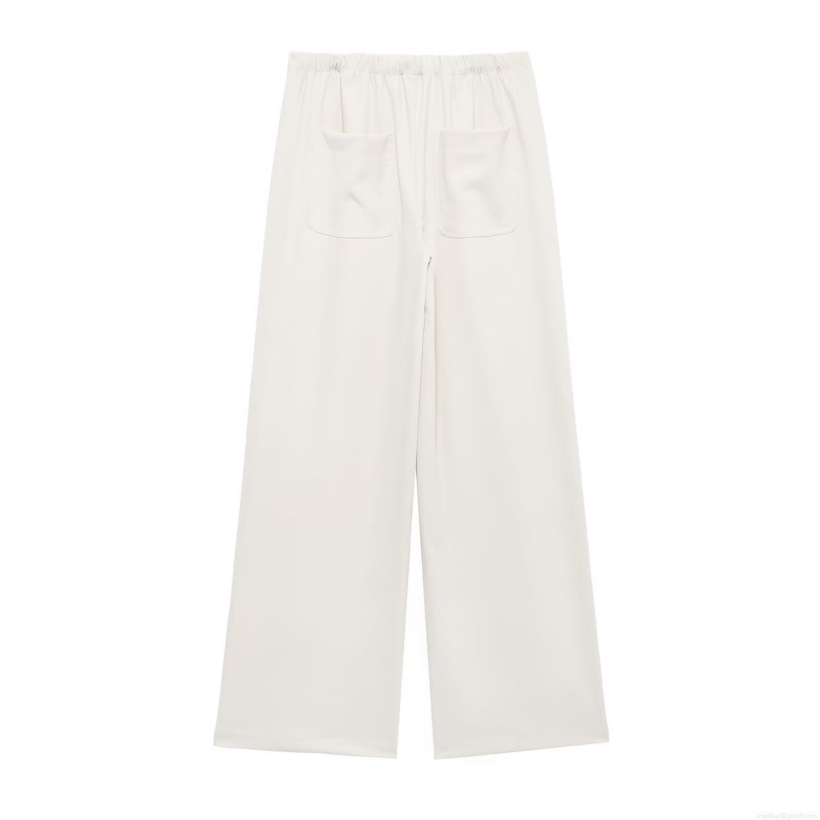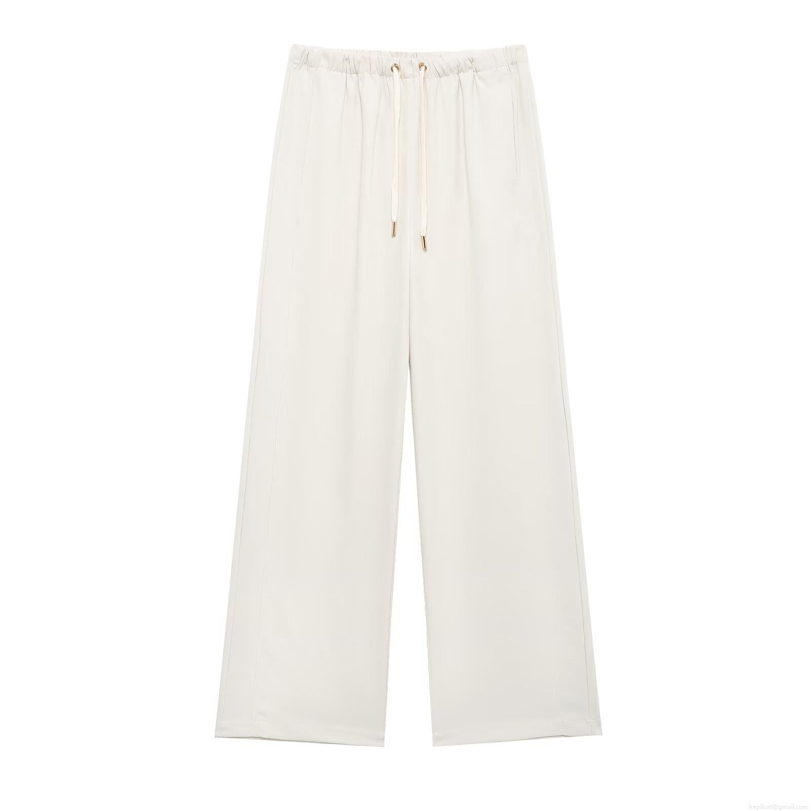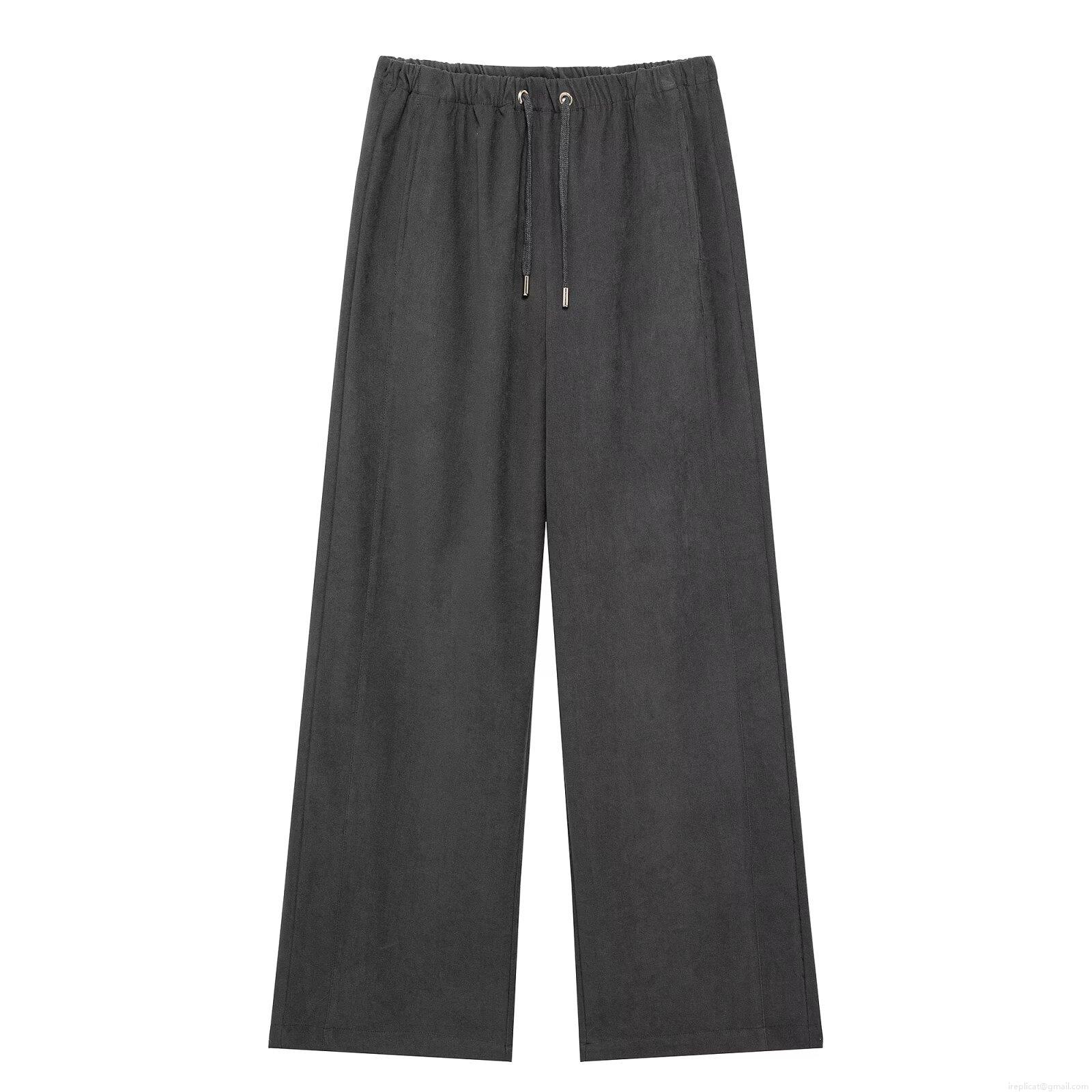 Women's Fashion Casual Wide Leg Pants 100% Polyester Solid Color Mid Waist Drawstring Long Trousers Streetwear Spring Loose Fit Bottoms