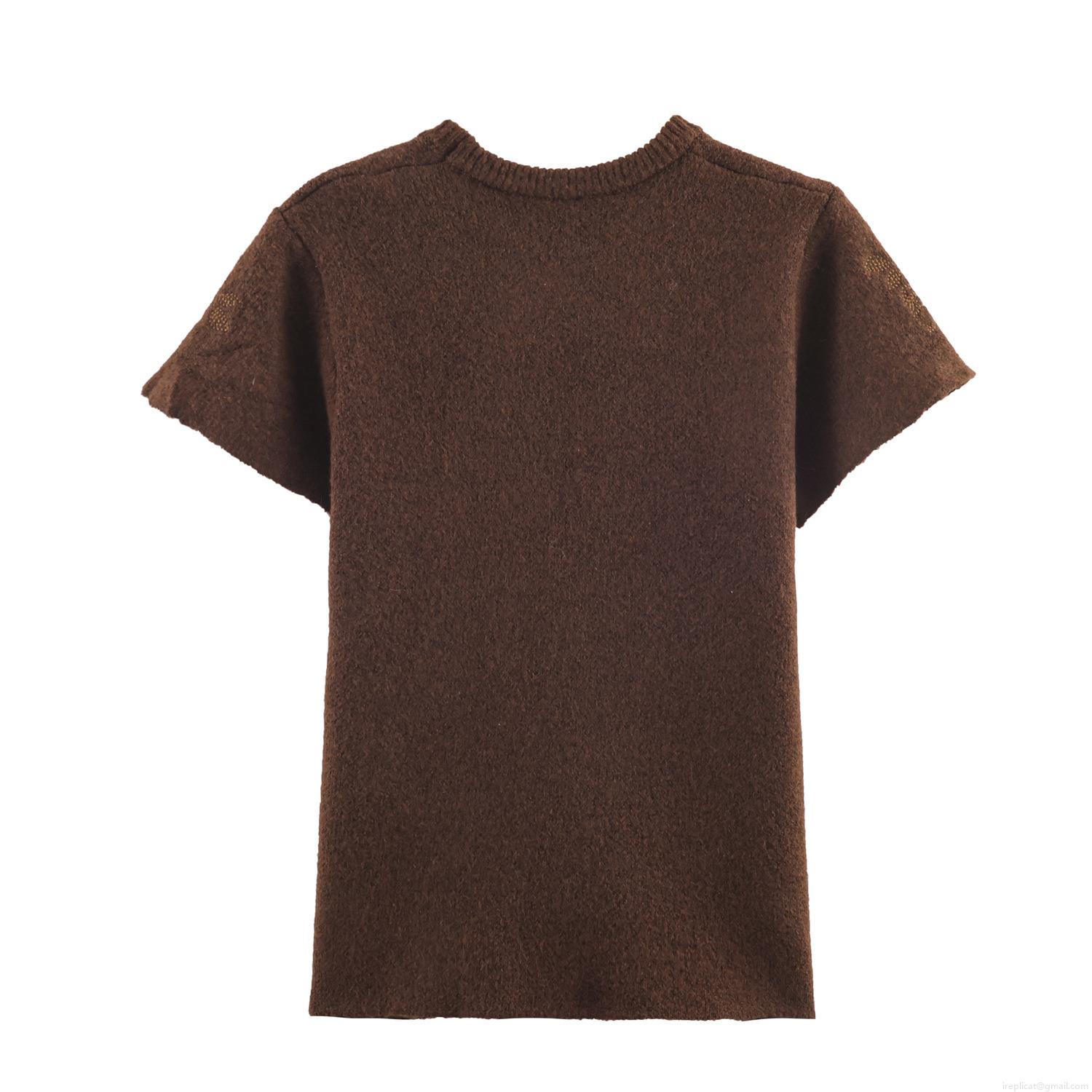 Women's Fashion Coffee Brown Short Sleeve Knit Sweater With Floral Embroidery Round Neck Pullover Polyester Top For Autumn Casual Daily Wear