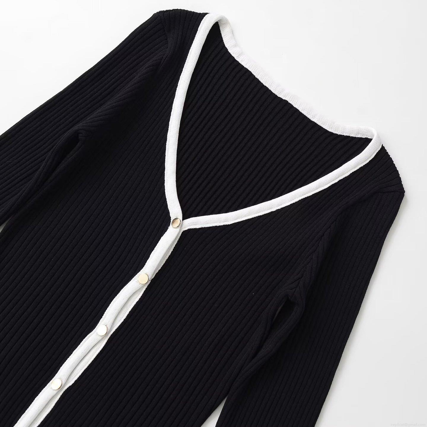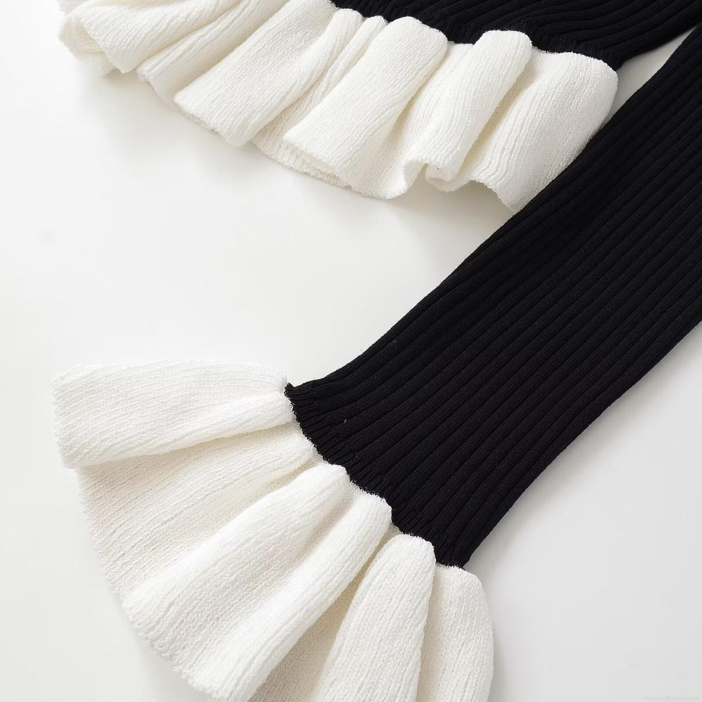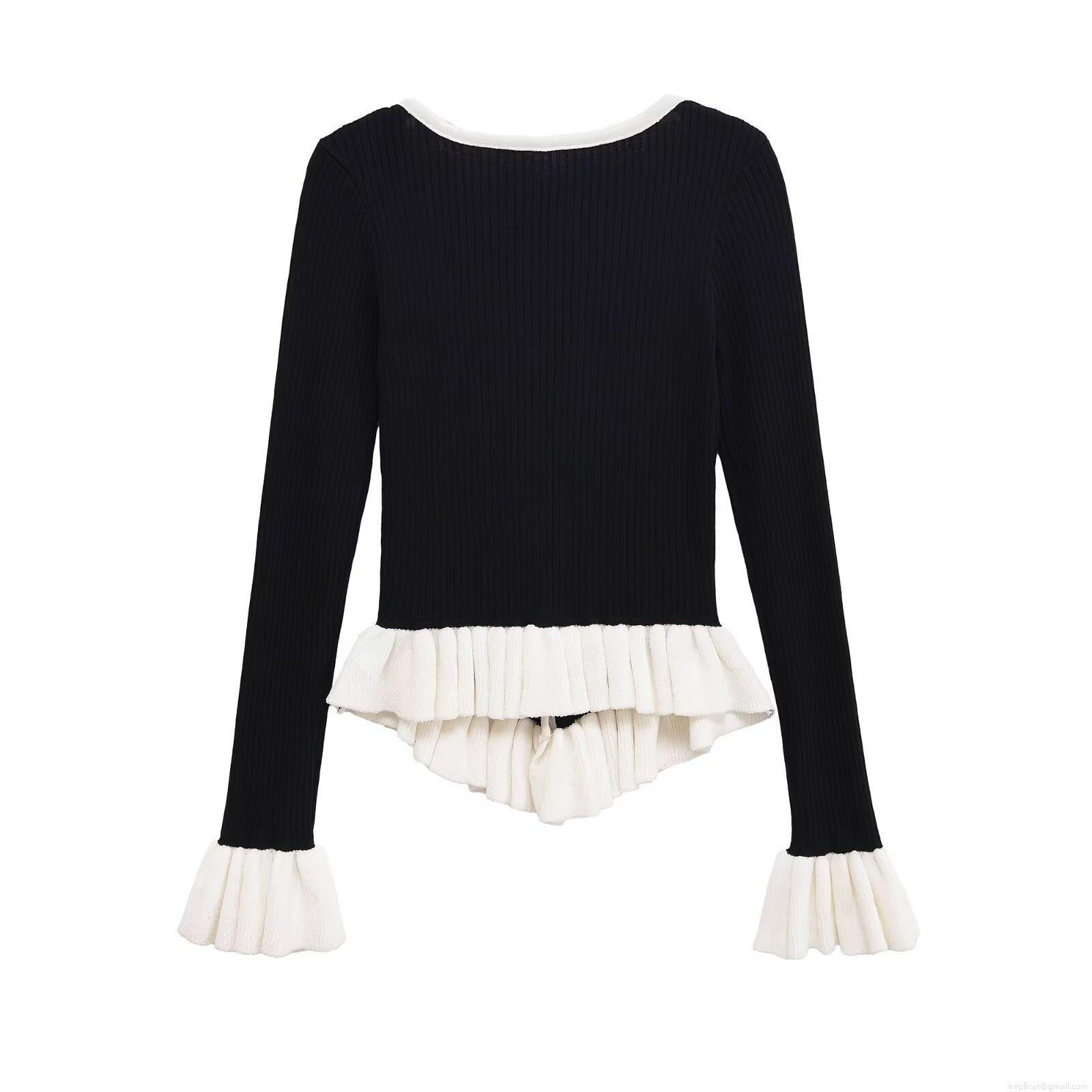 Women's Fashion Color Block Knitted Cardigan Jacket V-Neck Long Sleeve Ruffle Hem Ribbed Knit Sweater With Gold Buttons Elegant Socialite Style Tops For Women