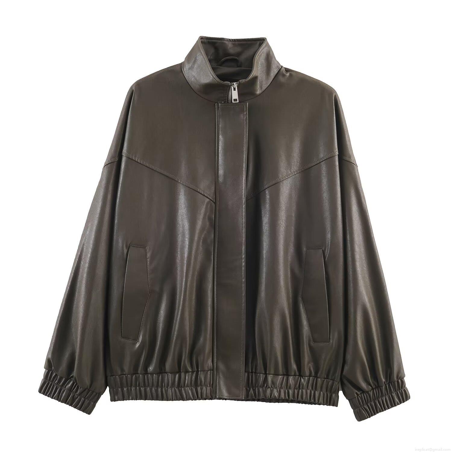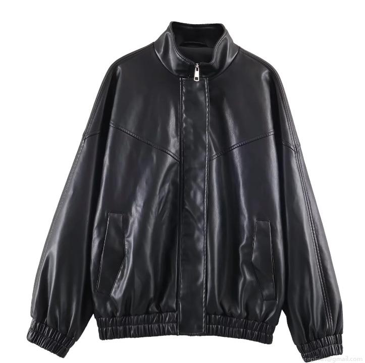 Women's Fashion Faux Leather Bomber Jacket Solid Color Stand Collar Zip Up Windproof Moto Biker Outerwear Casual Streetwear Coat For Women