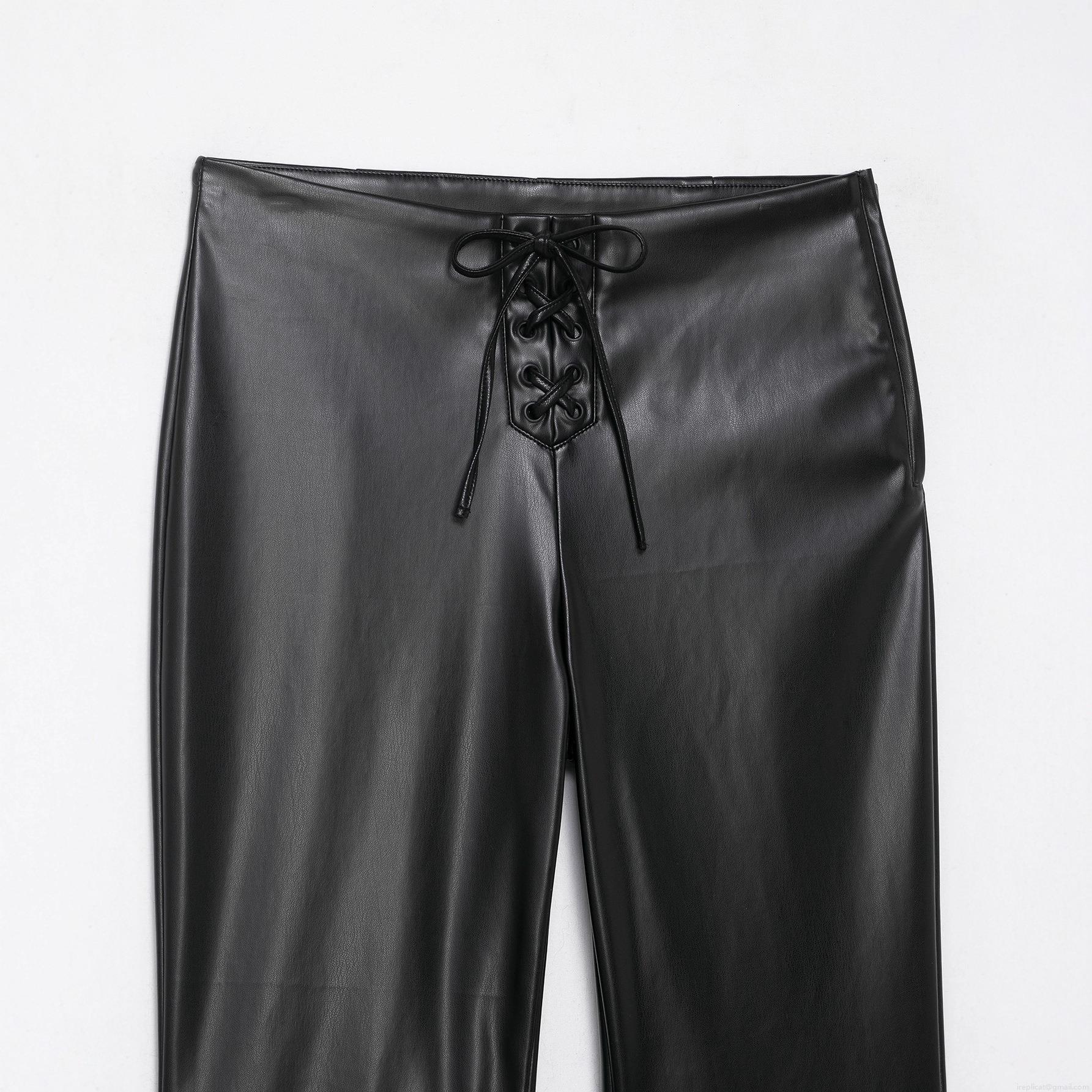 Women's Fashion Faux Leather Flare Pants High Waist Cross Tie-Up Front PU Leather Trousers Slim Fit Black Bell Bottoms For Party Club Night Out