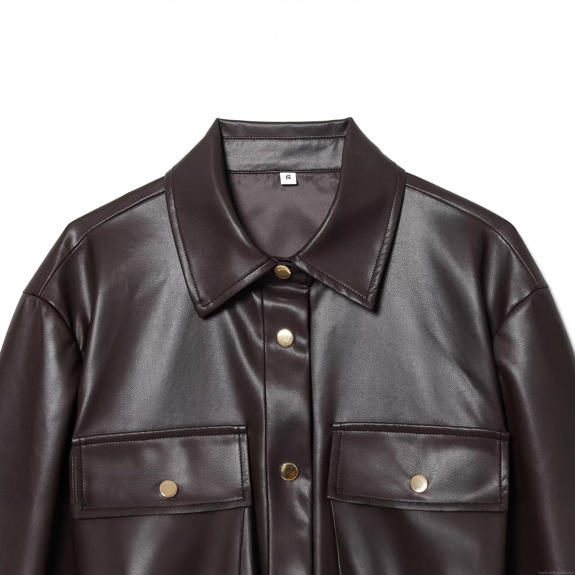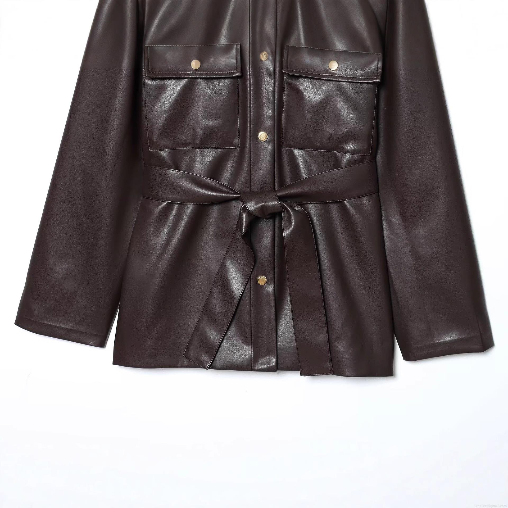 Women's Fashion Faux Leather Long Jacket With Belt Chic Deep Brown PU Shacket Autumn Winter Casual Coat With Metal Buttons And Cargo Pockets For Ladies