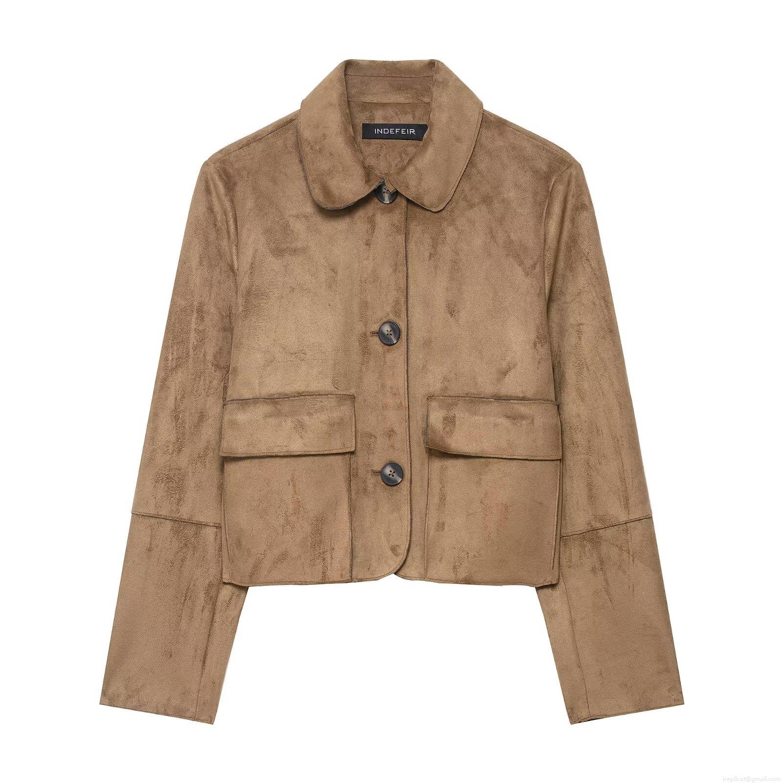 Women's Fashion Faux Suede Cropped Jacket Vintage Solid Color Lapel Long Sleeve Single Breasted Button Outwear With Large Pockets Casual Streetwear Coat