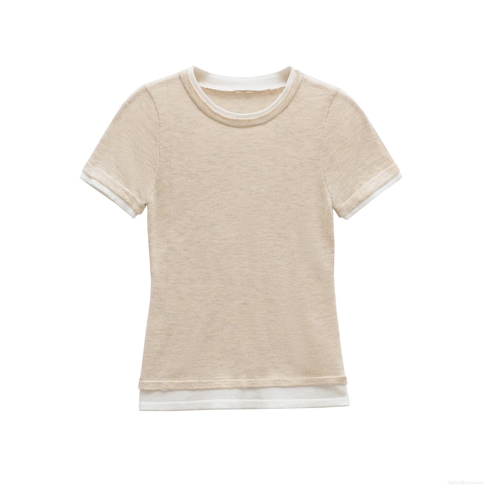 Women's Fashion Knitted Fake Two-Piece Short Sleeve T-Shirt Slim Fit Contrast Trim Round Neck Casual Summer Top
