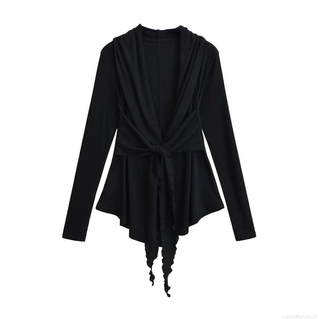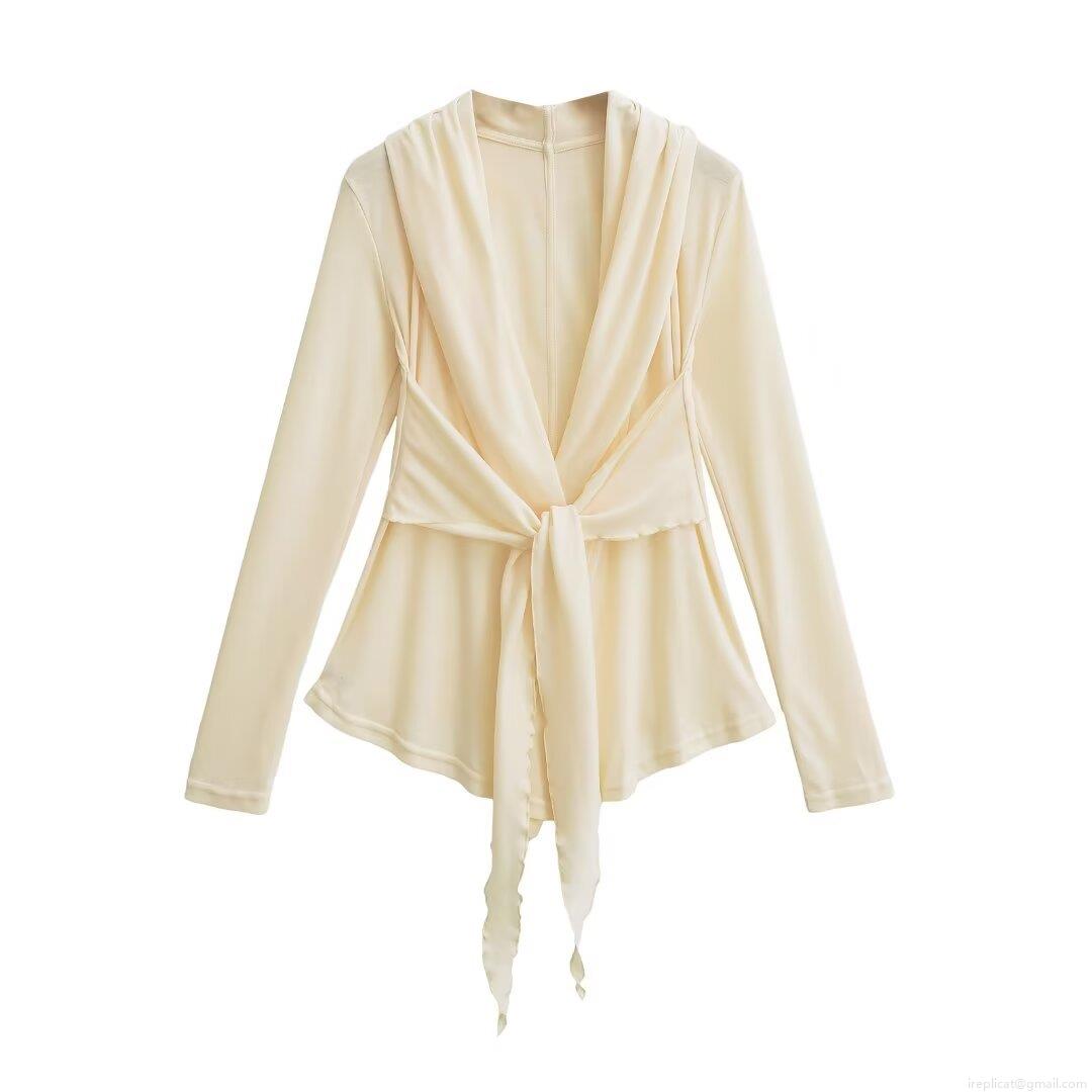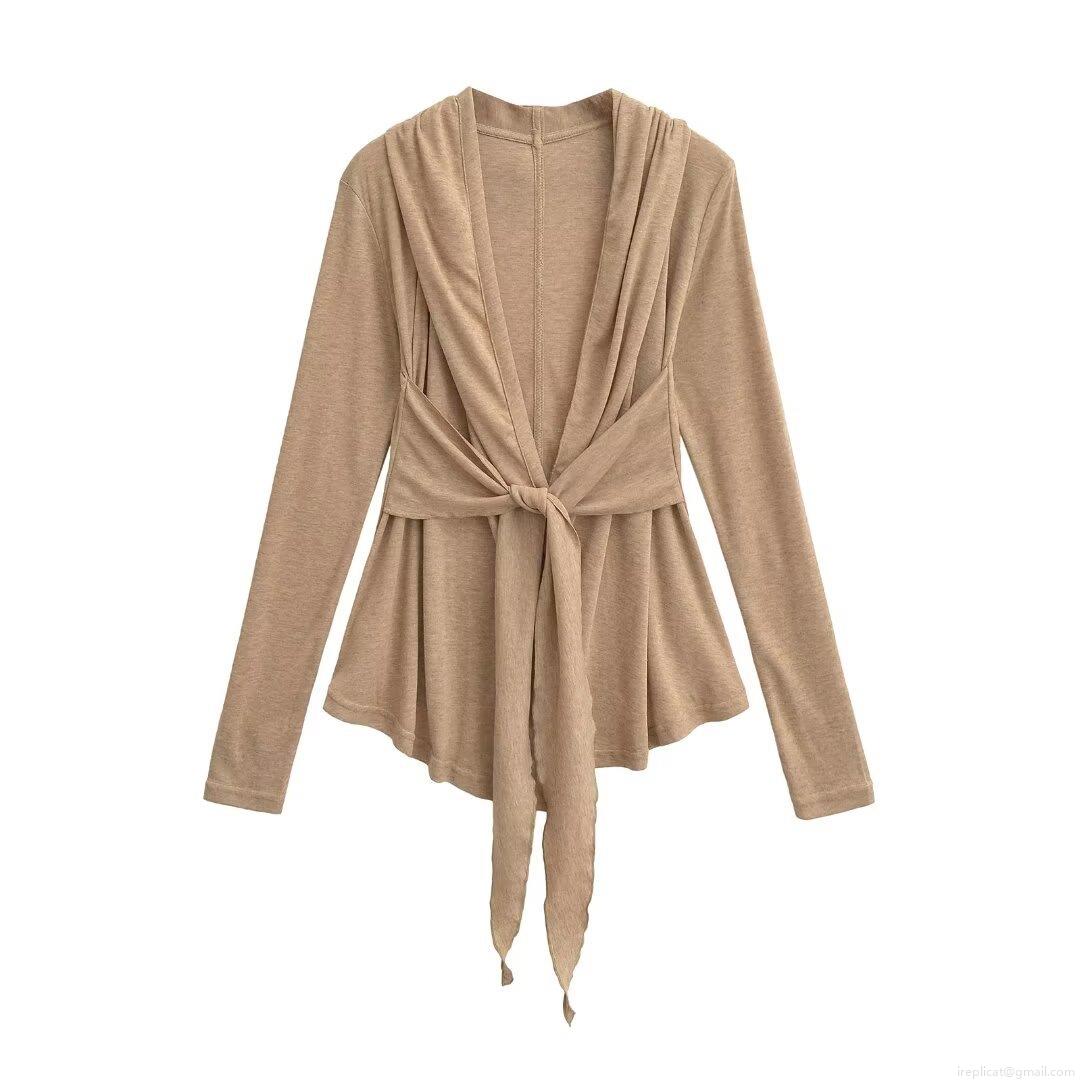 Women's Fashion Lace Up Long Sleeve Wrap Top V Neck Solid Color Polyester T-Shirt Slim Fit Cardigan Blouse For Autumn Winter Casual Streetwear