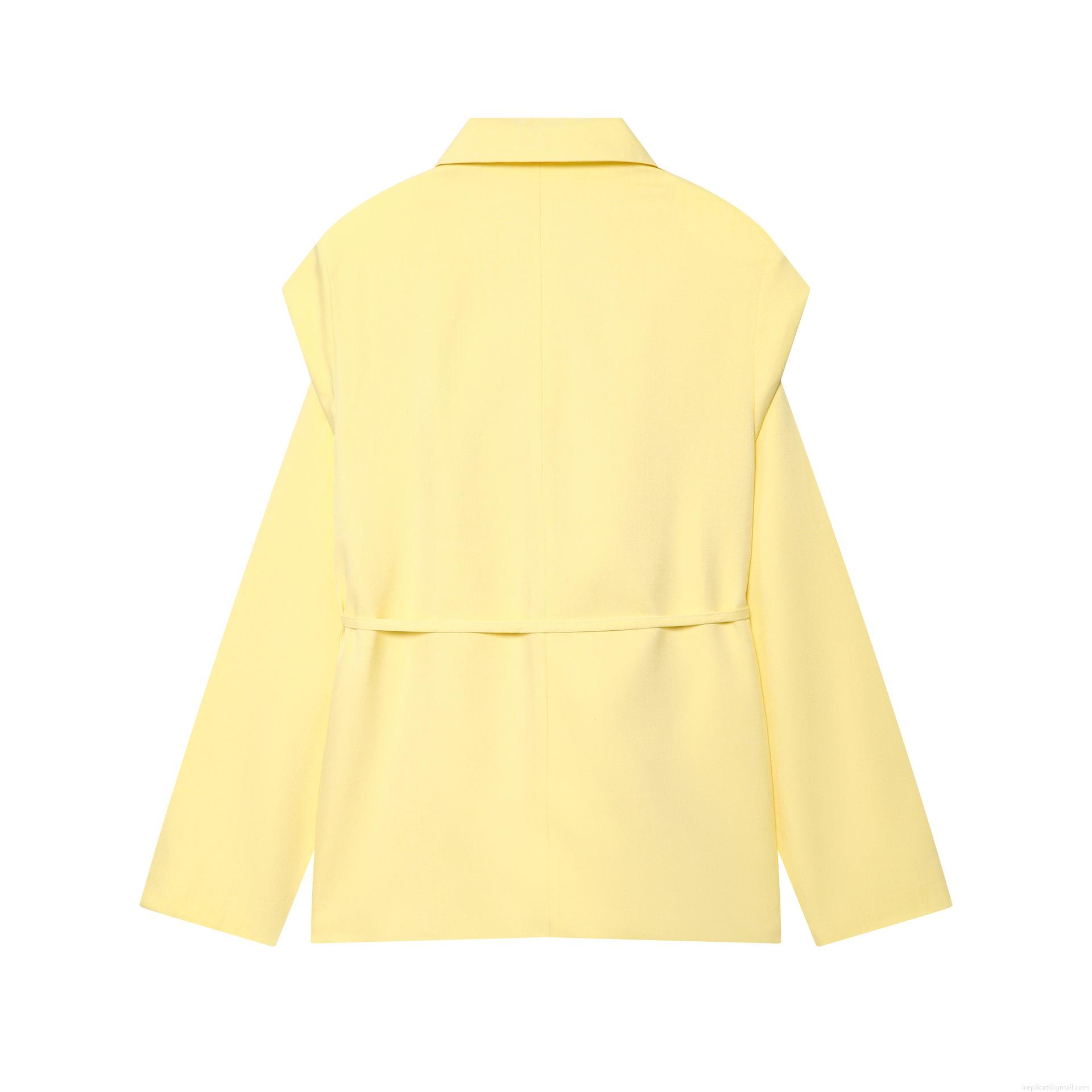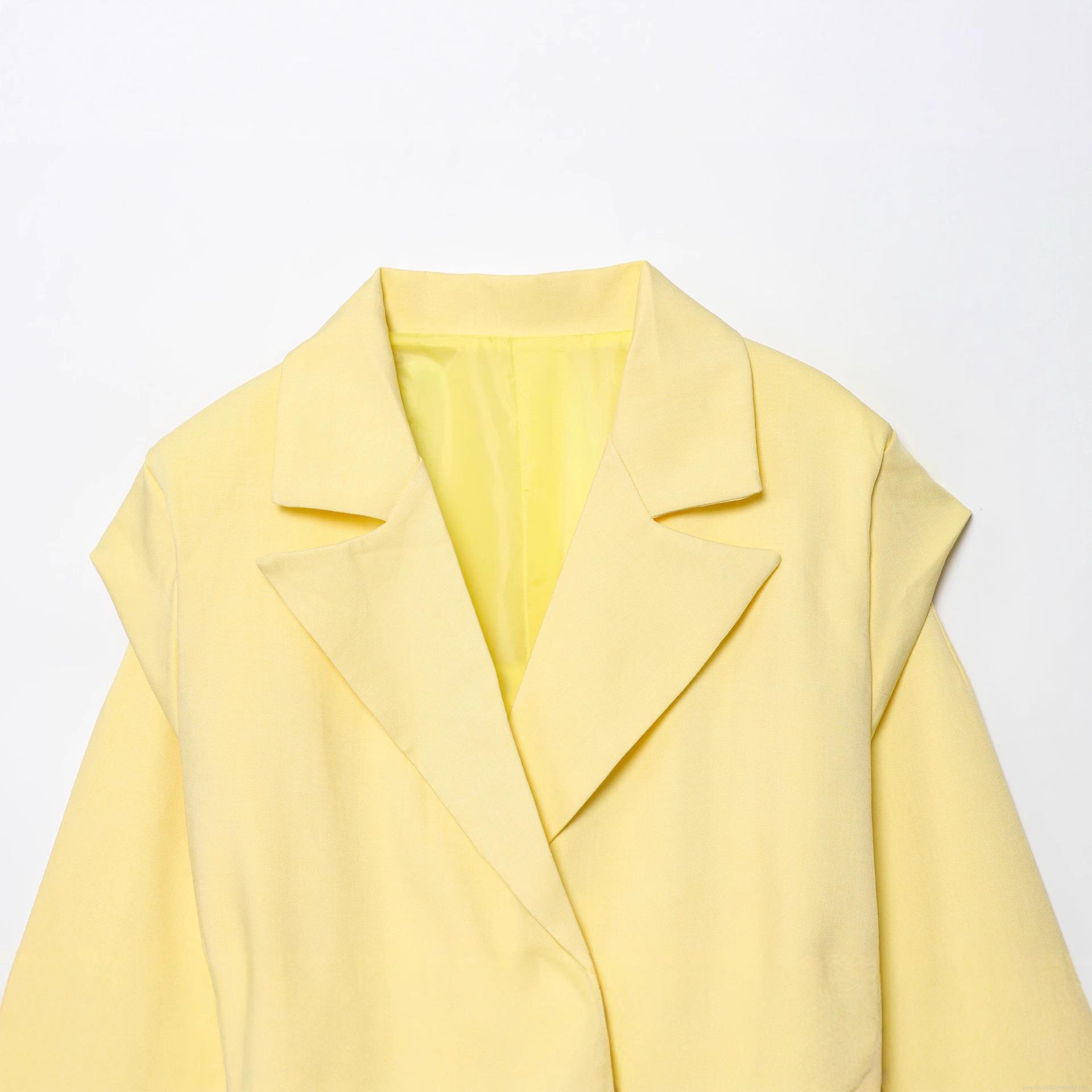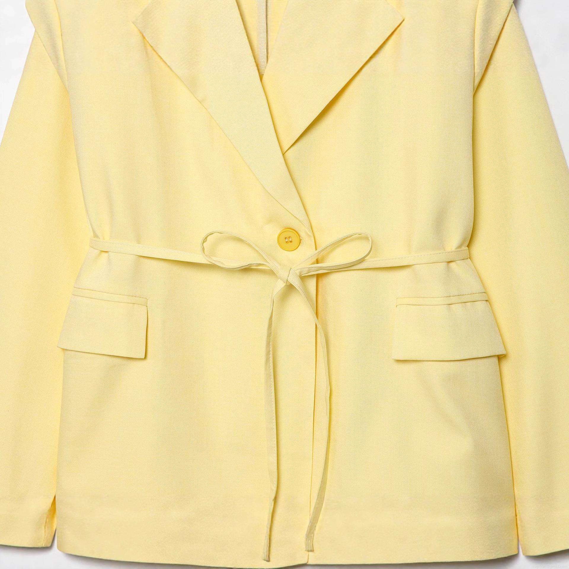 Women's Fashion Lemon Yellow Blazer With Waist Belt Long Sleeve Suit Collar Polyester Solid Color Casual Office Jacket Elegant Suit Coat For Women