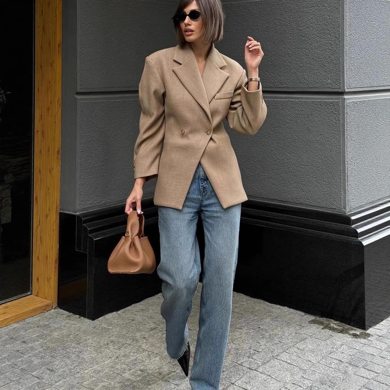 Women's Fashion Oversized Double Breasted Blazer Jacket Casual Long Sleeve Notched Lapel Khaki Office Commuter Suit Coat