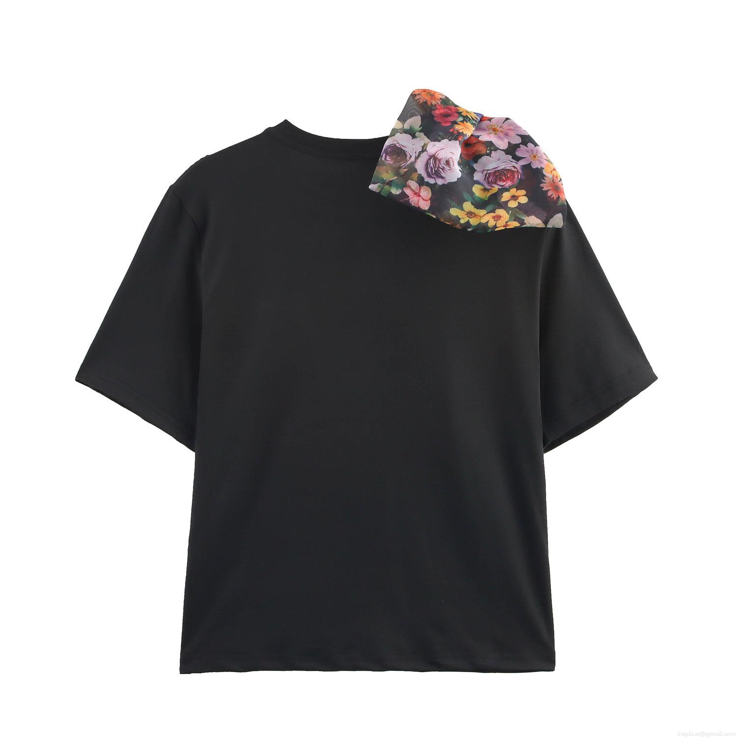 Women's Fashion Polyester T-Shirt With Large Floral Organza Bow Spliced Round Neck Casual Short Sleeve Pullover Top