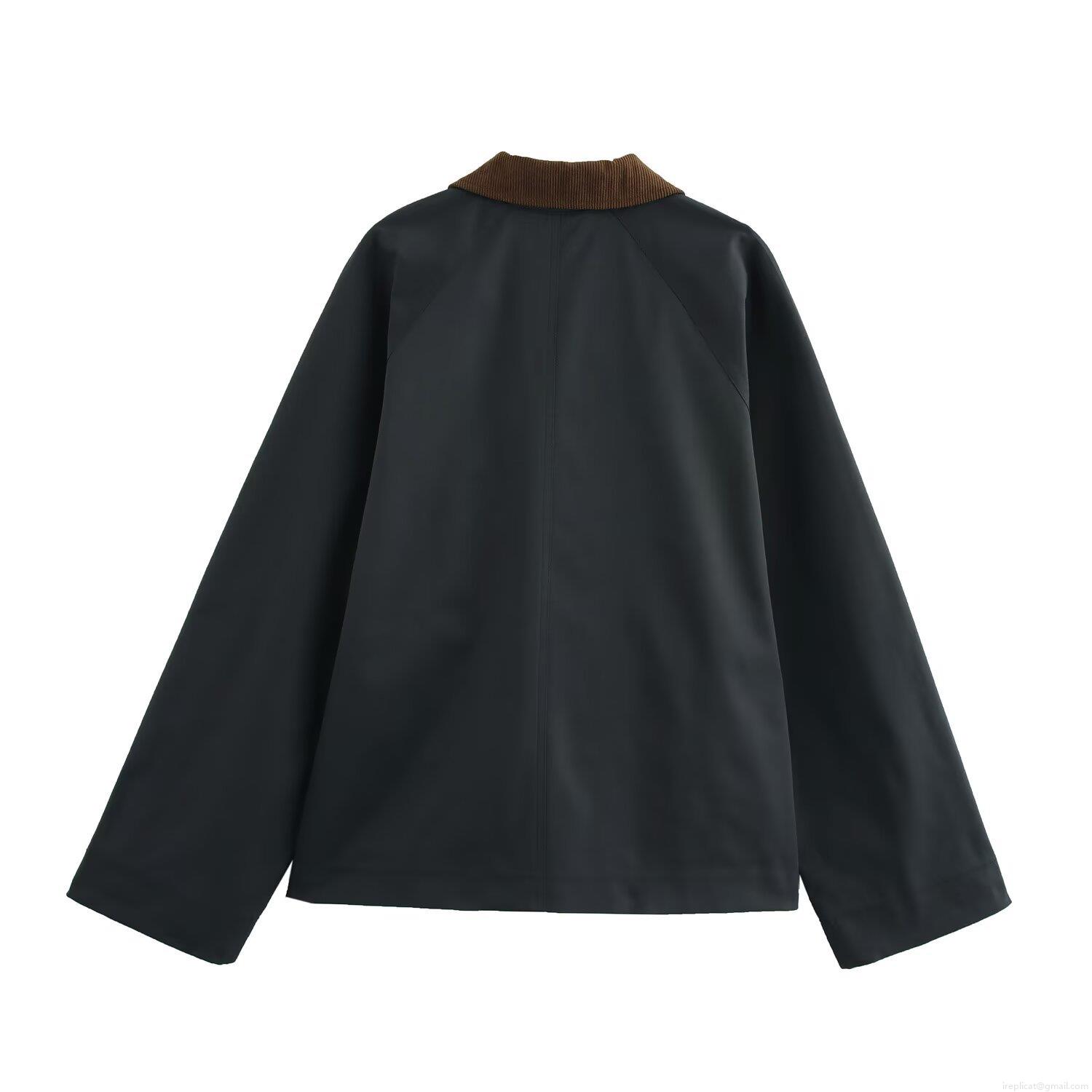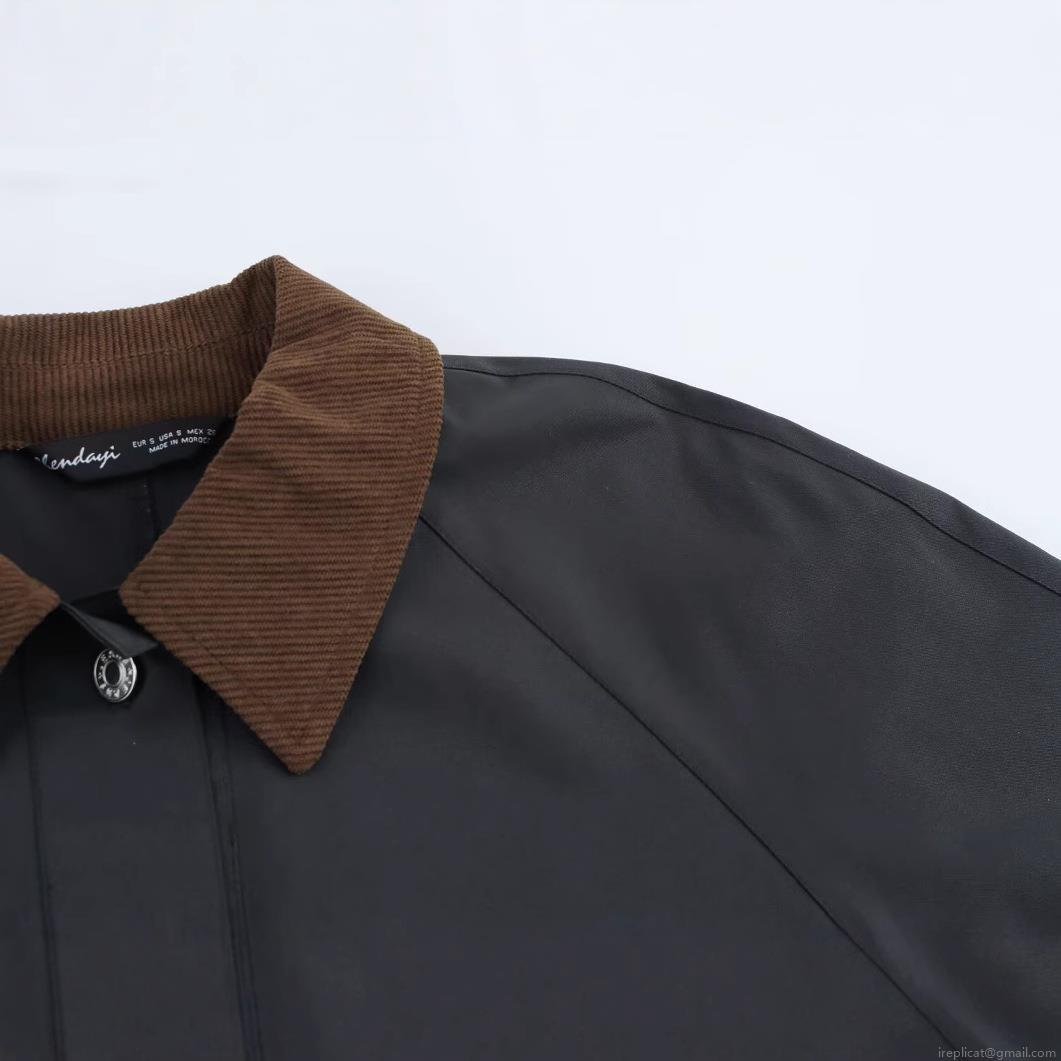 Women's Fashion PU Leather Jacket With Brown Corduroy Collar Single Breasted Mid Length Long Sleeve Streetwear Coat For Spring Autumn Outerwear