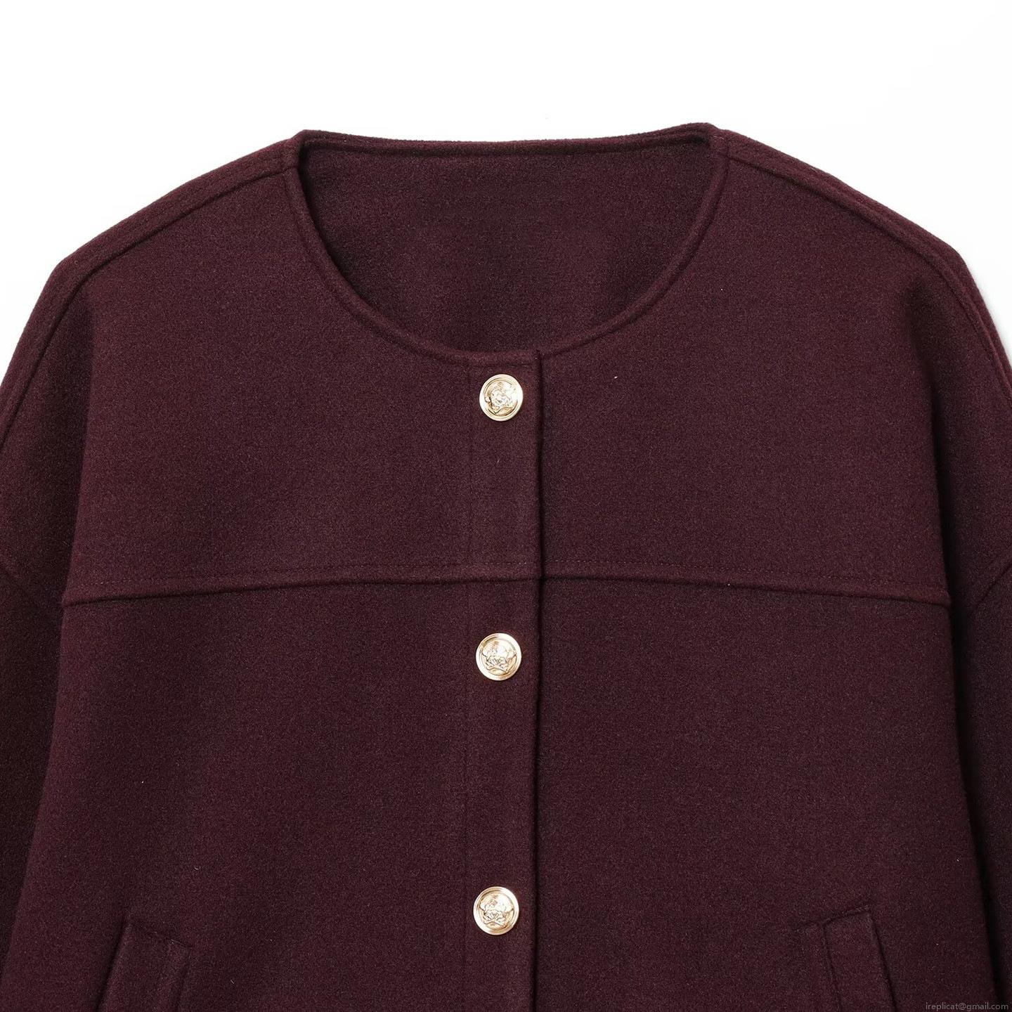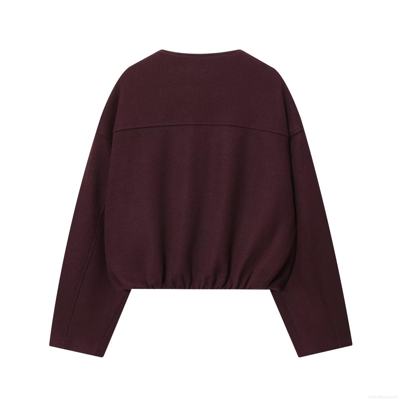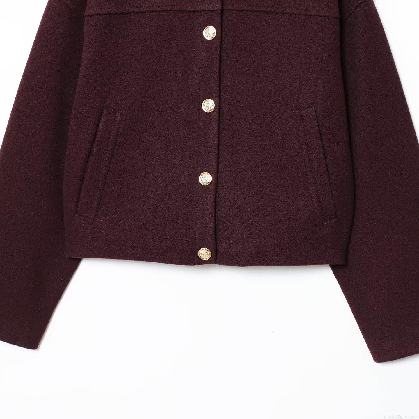 Women's Fashion Round Neck Short Jacket Elegant Wine Red Faux Wool Coat With Gold Lion Buttons Long Sleeve Solid Color Casual Outerwear For Fall Women