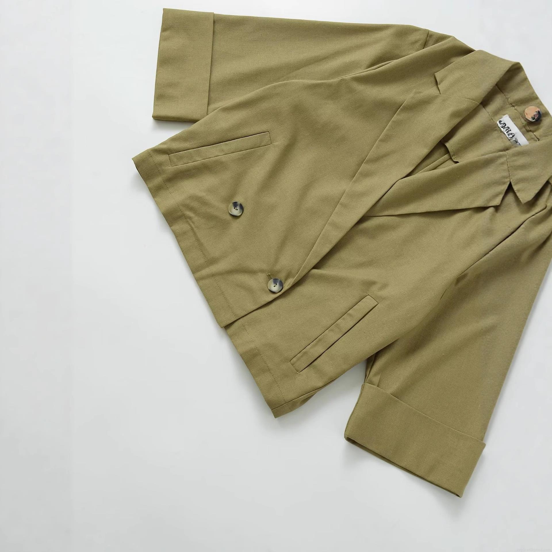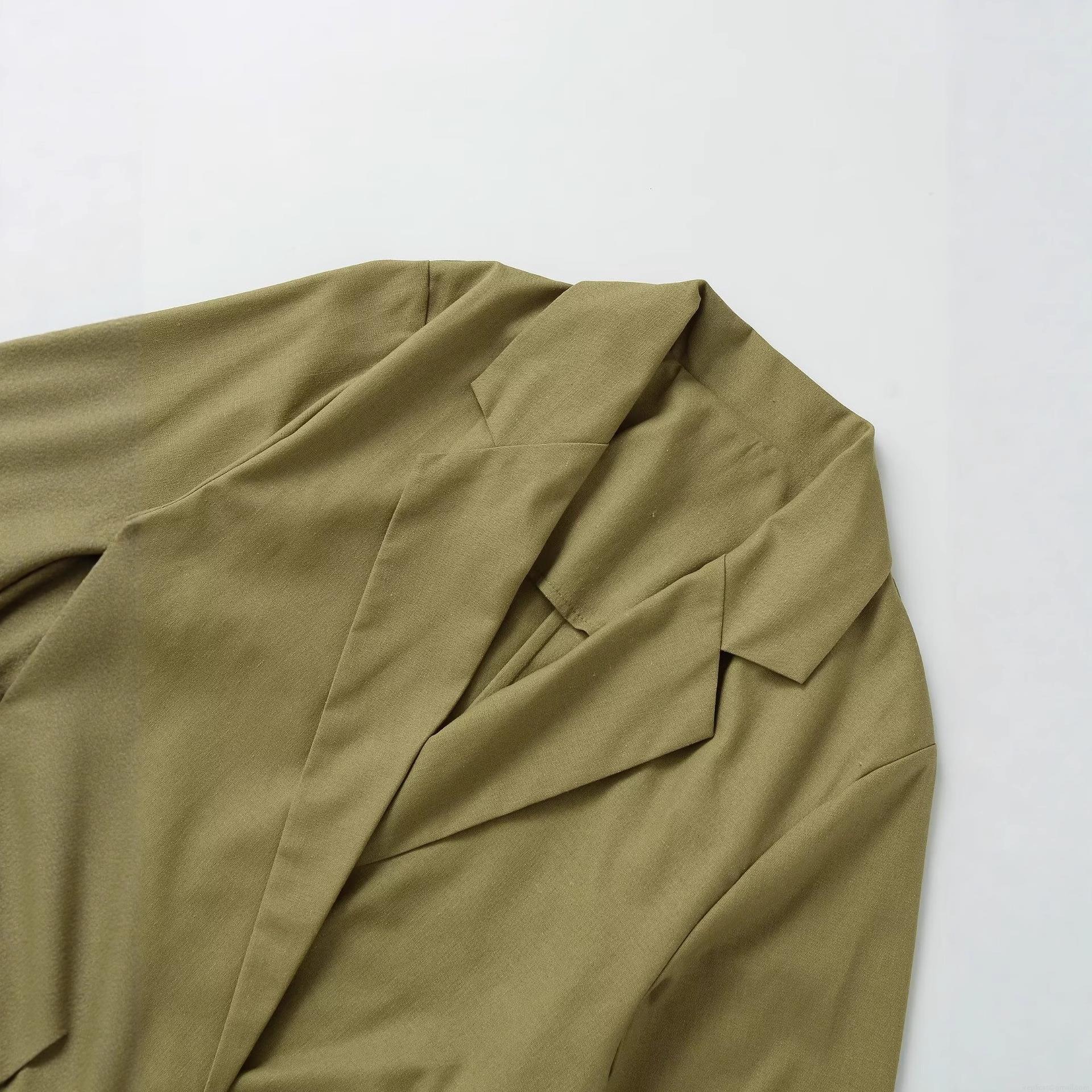 Women's Fashion Short Blazer Jacket Solid Olive Green Double Breasted Three Quarter Sleeve Lapel Collar Casual Outerwear Linen Look Suit Coat For Ladies