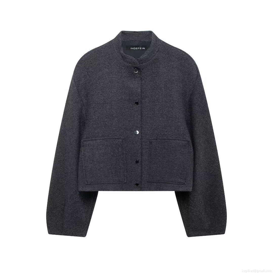 Women's Fashion Short Bomber Jacket Woolen Texture Coat With Patch Pockets Round Neck Button Down Long Sleeve Outwear Casual Streetwear For Autumn Winter