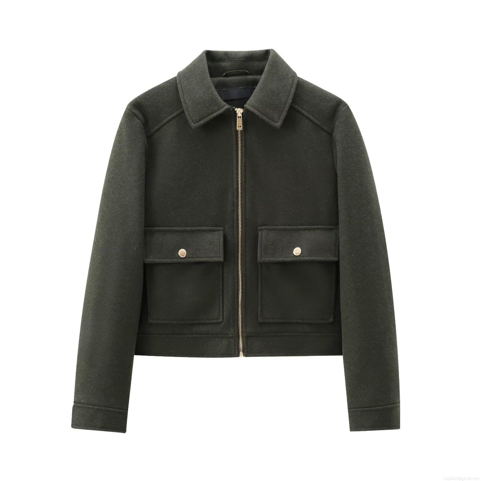 Women's Fashion Short Wool Blend Jacket Lapel Long Sleeve Zipper Baseball Uniform Coat Solid Color Streetwear Outerwear With Large Pockets