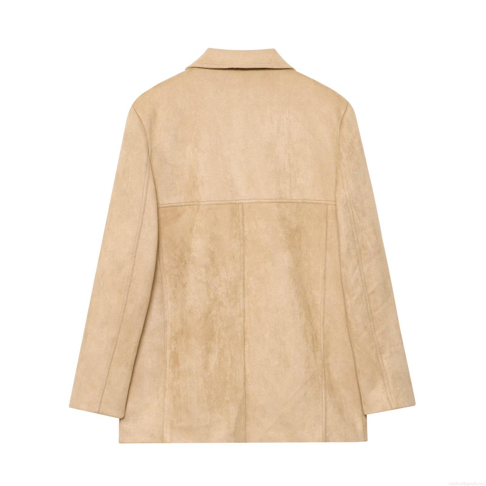 Women's Fashion Suede Texture Blazer Notched Lapel Single Breasted Long Sleeve Mid-Length Khaki Outerwear Casual Office Suit Jacket
