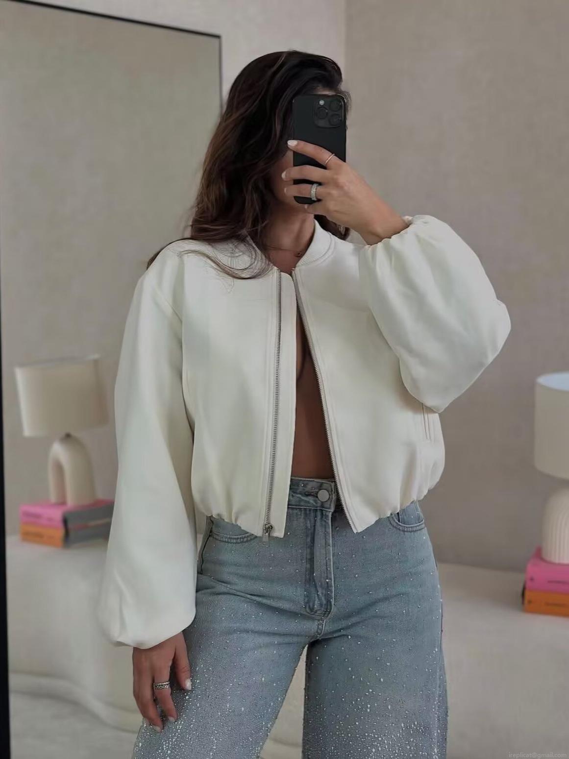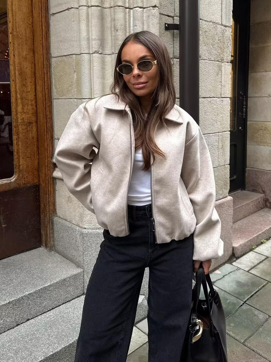 Women's Fashion Suede Zipper Jacket Loose Bomber Jacket With Lapel Collar Solid Color Long Sleeve Short Outerwear Streetwear For Spring Autumn