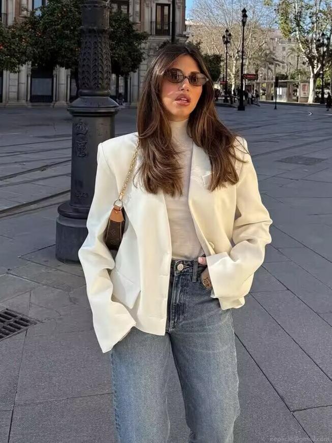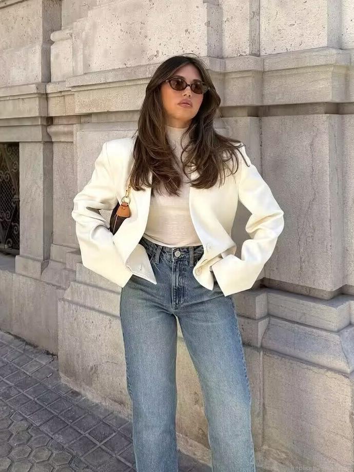 Women's Fashion V-Neck Short Blazer Jacket 100% Polyester Long Sleeve Pocketed Single-Breasted Outerwear European Street Style Professional Commute Solid Color White Coat