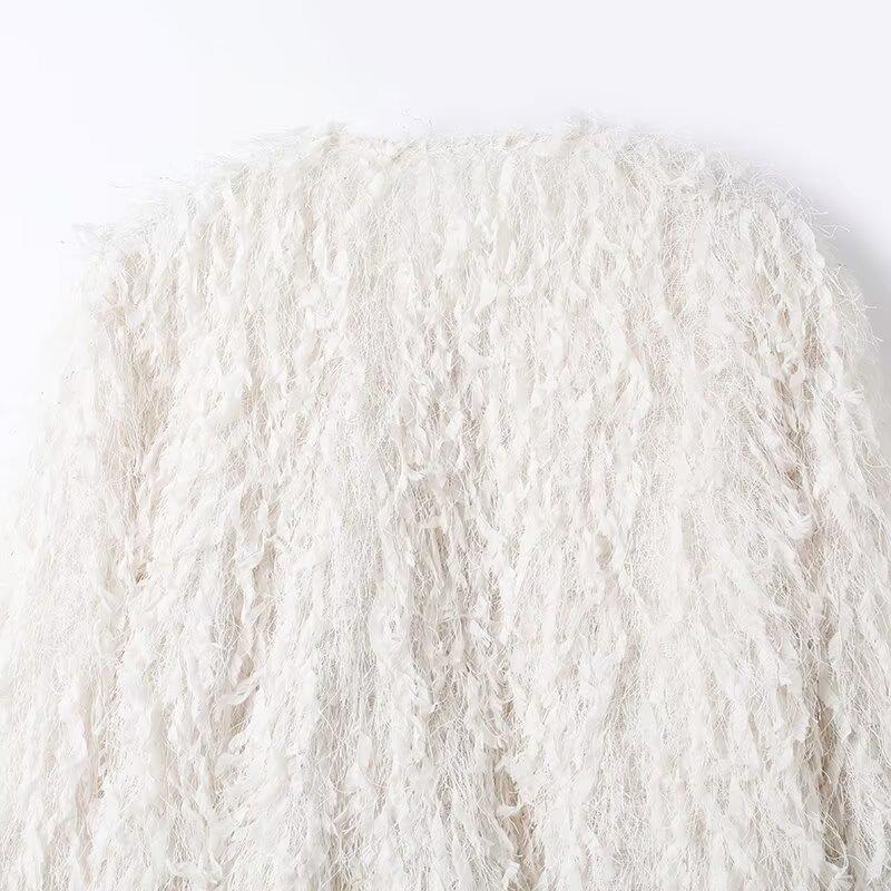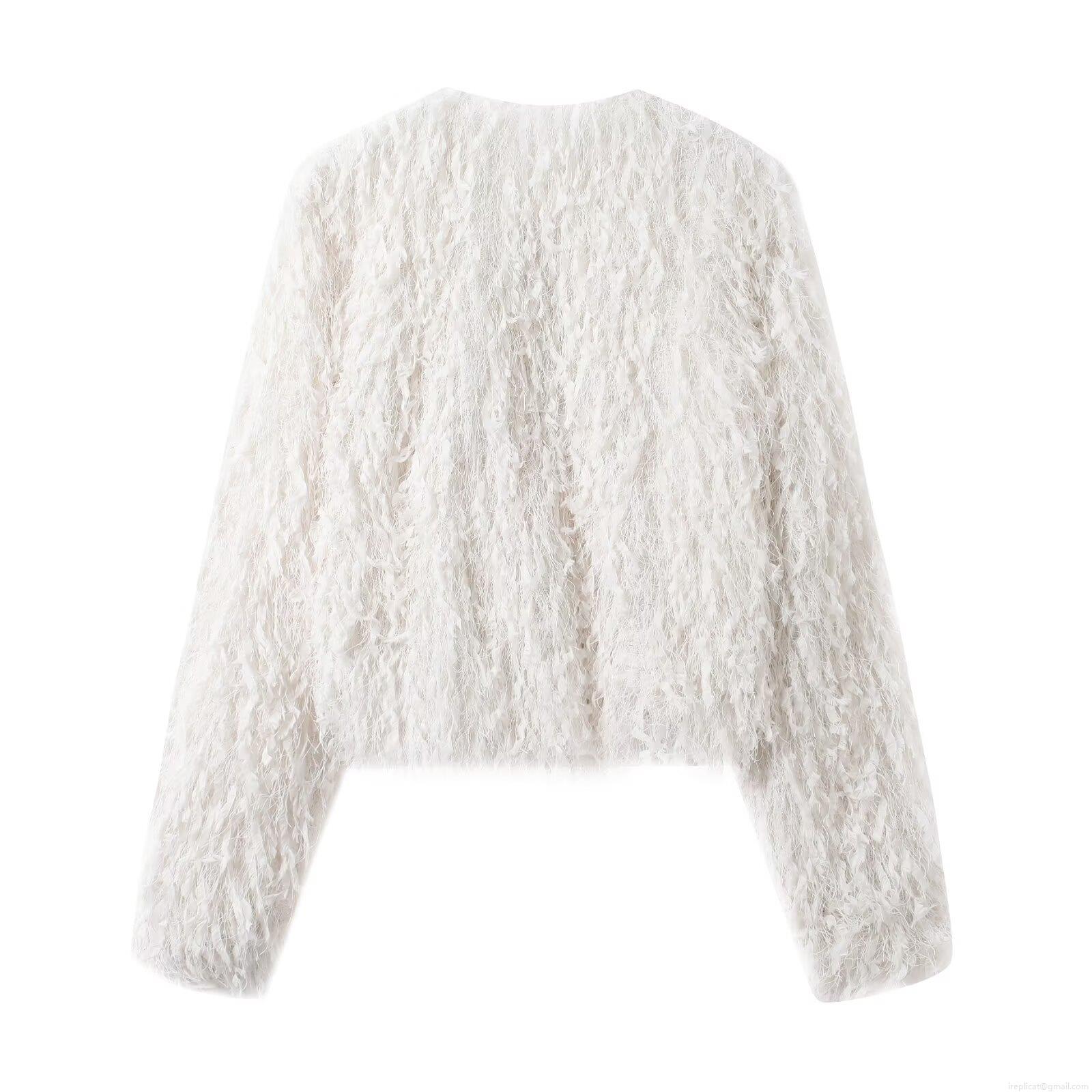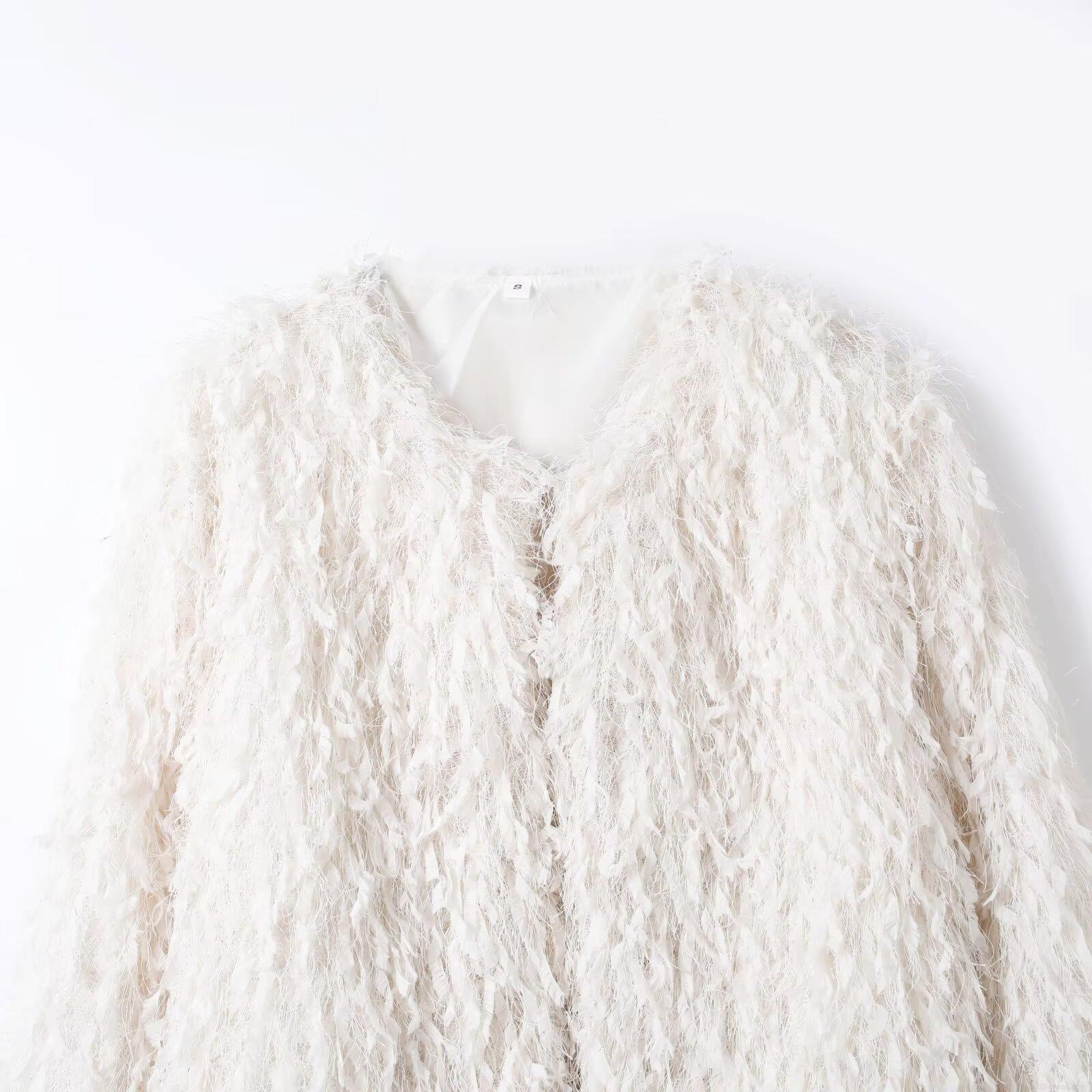 Women's Fashion White Fringe Faux Feather Jacket Elegant Long Sleeve Cardigan With Metal Hook For Party Daily Wear Outwear Top