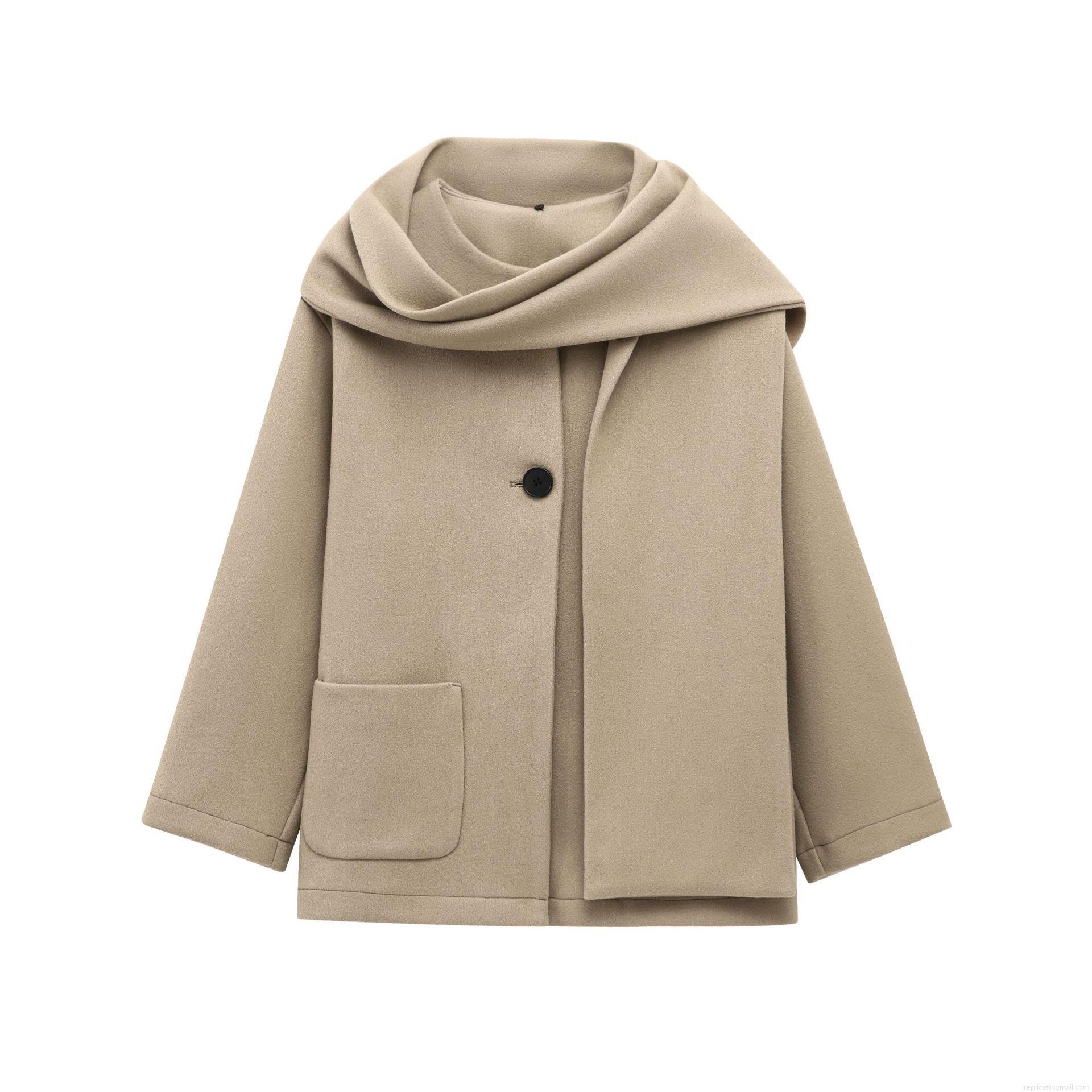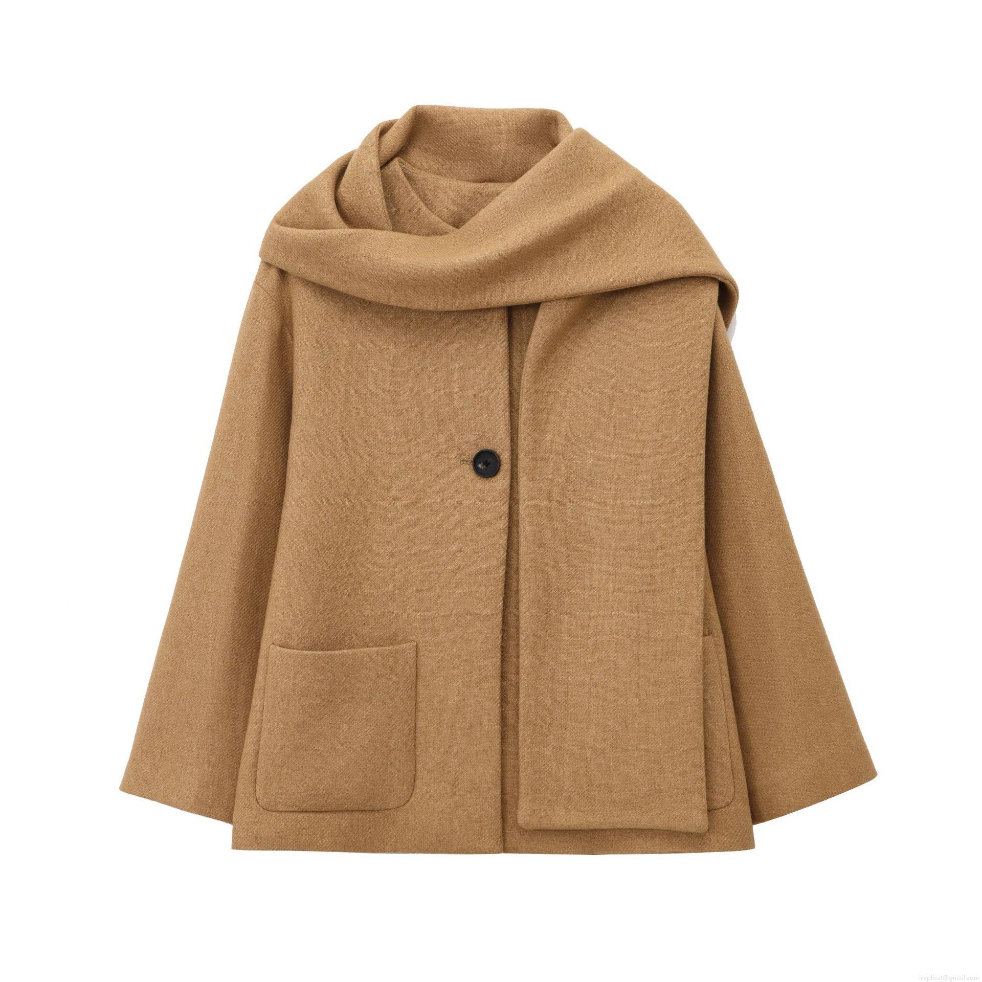 Women's Fashionable Woolen Look Coat With Scarf Long Sleeve One Button Mid-Length Polyester Blended Jacket Outerwear For Fall Winter Street Style Ladies Clothing