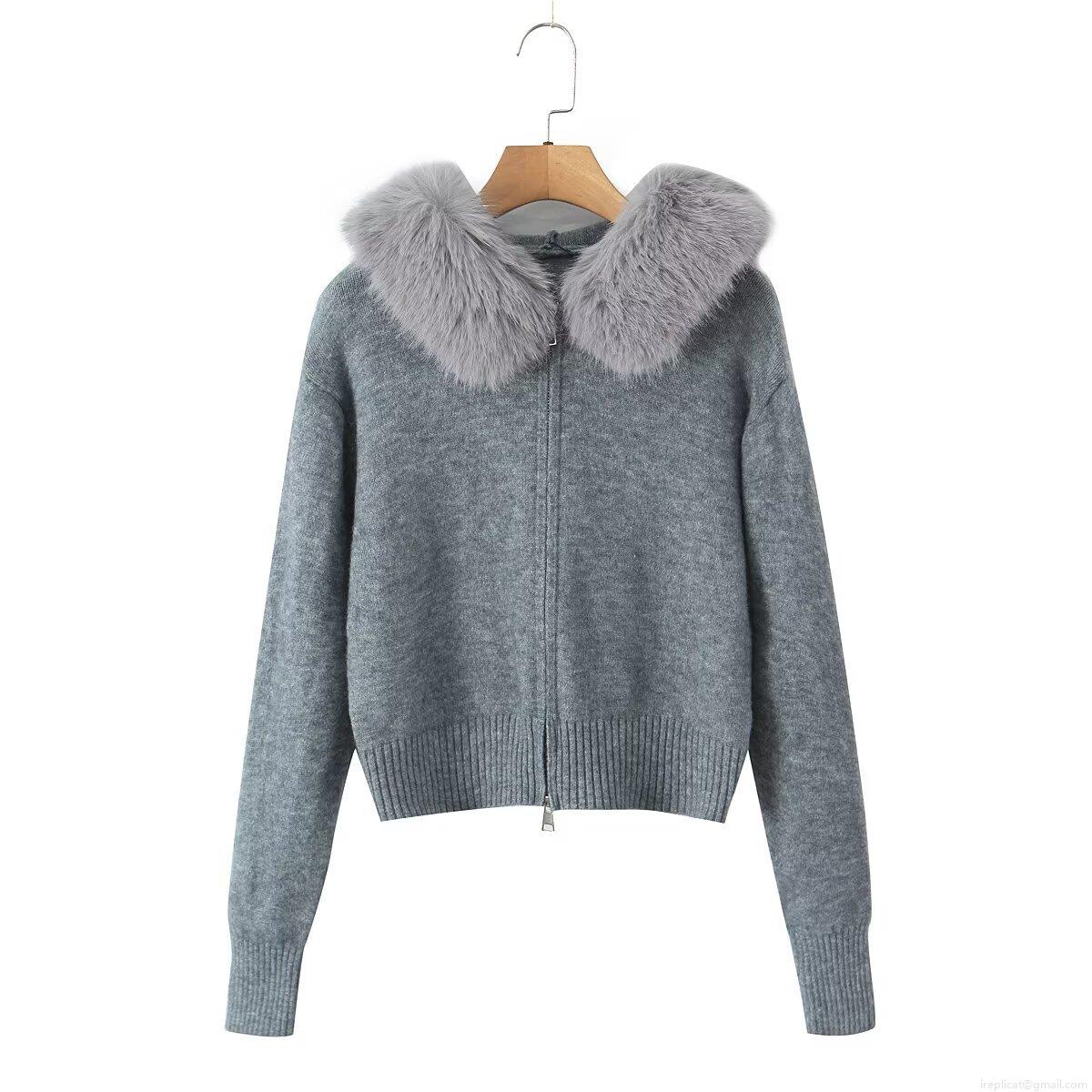 Women's Faux Fur Collar Hooded Knit Cardigan Sweater Jacket Zip Up Long Sleeve Loose Casual Winter Outerwear Warm Knitwear