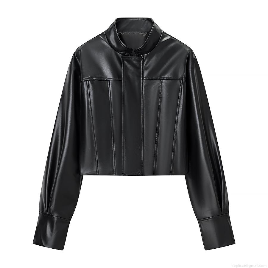 Women's Faux Leather Moto Jacket Streetwear Slim Short PU Leather Coat With High Neck For Autumn Winter Black Outwear