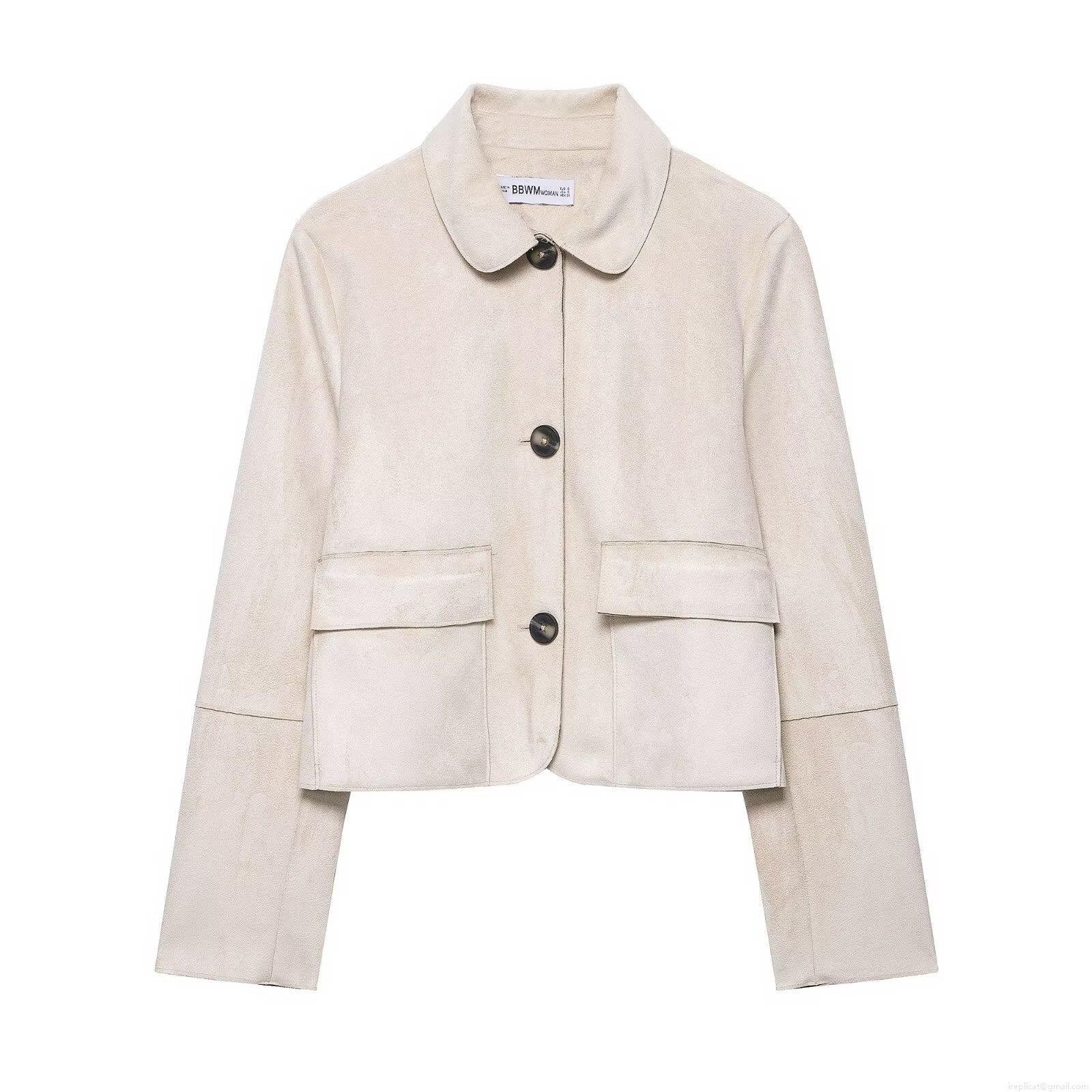 Women Suede Texture Short Jacket Long Sleeve Turnover Collar Single...