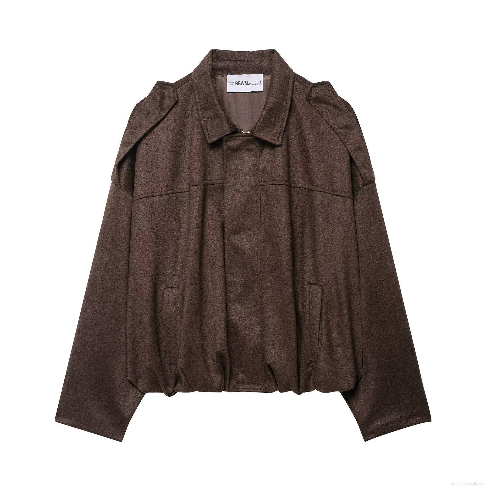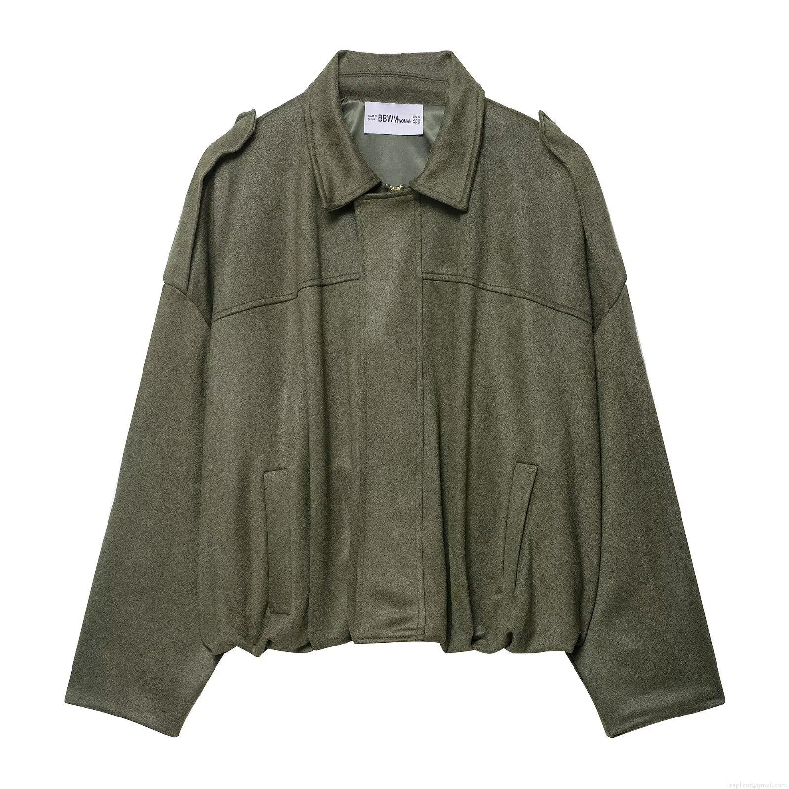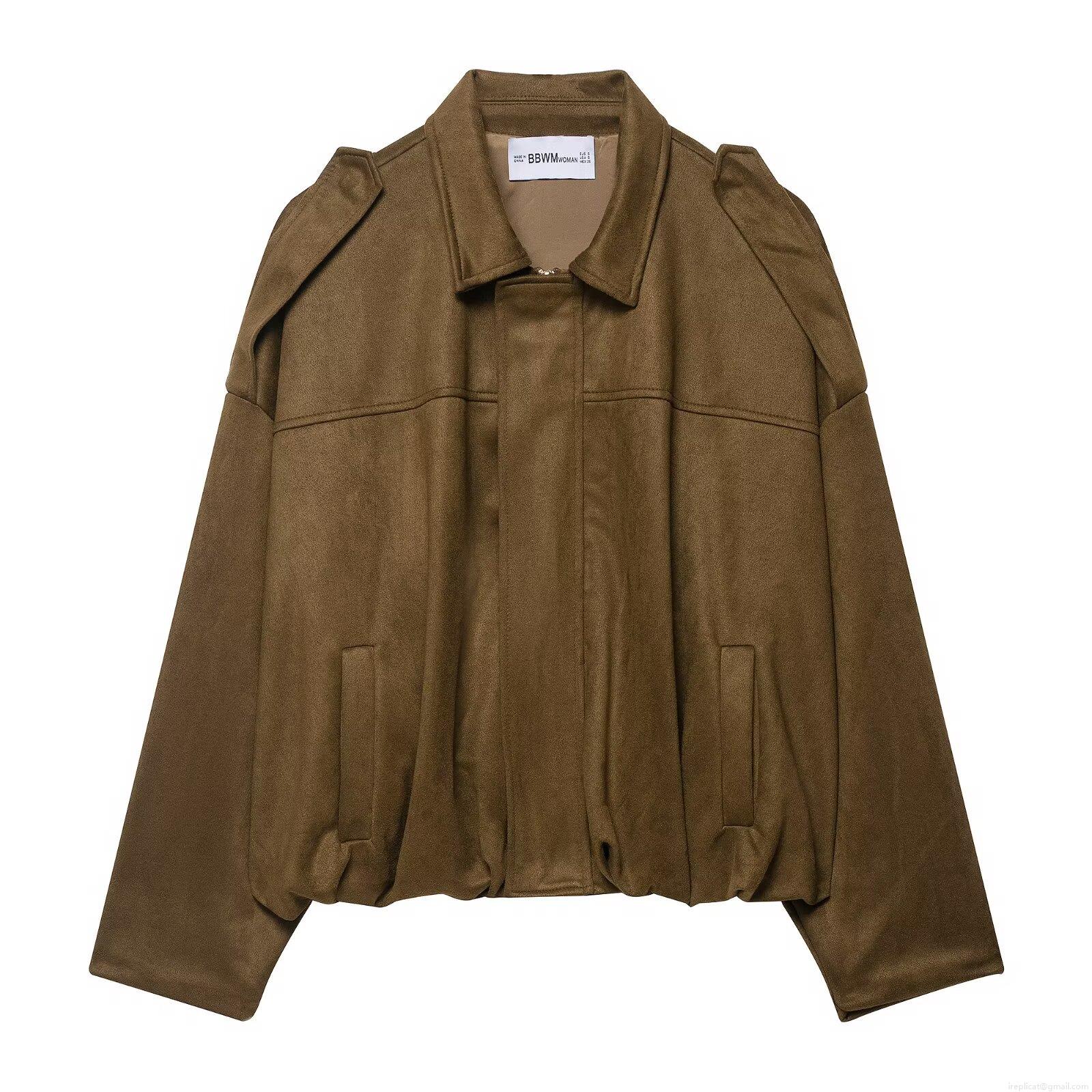 Women's Faux Suede Zip Up Jacket Lapel Collar Loose Fit Baseball Coat With Pockets And Shoulder Straps Vintage Streetwear Outerwear For Autumn Winter