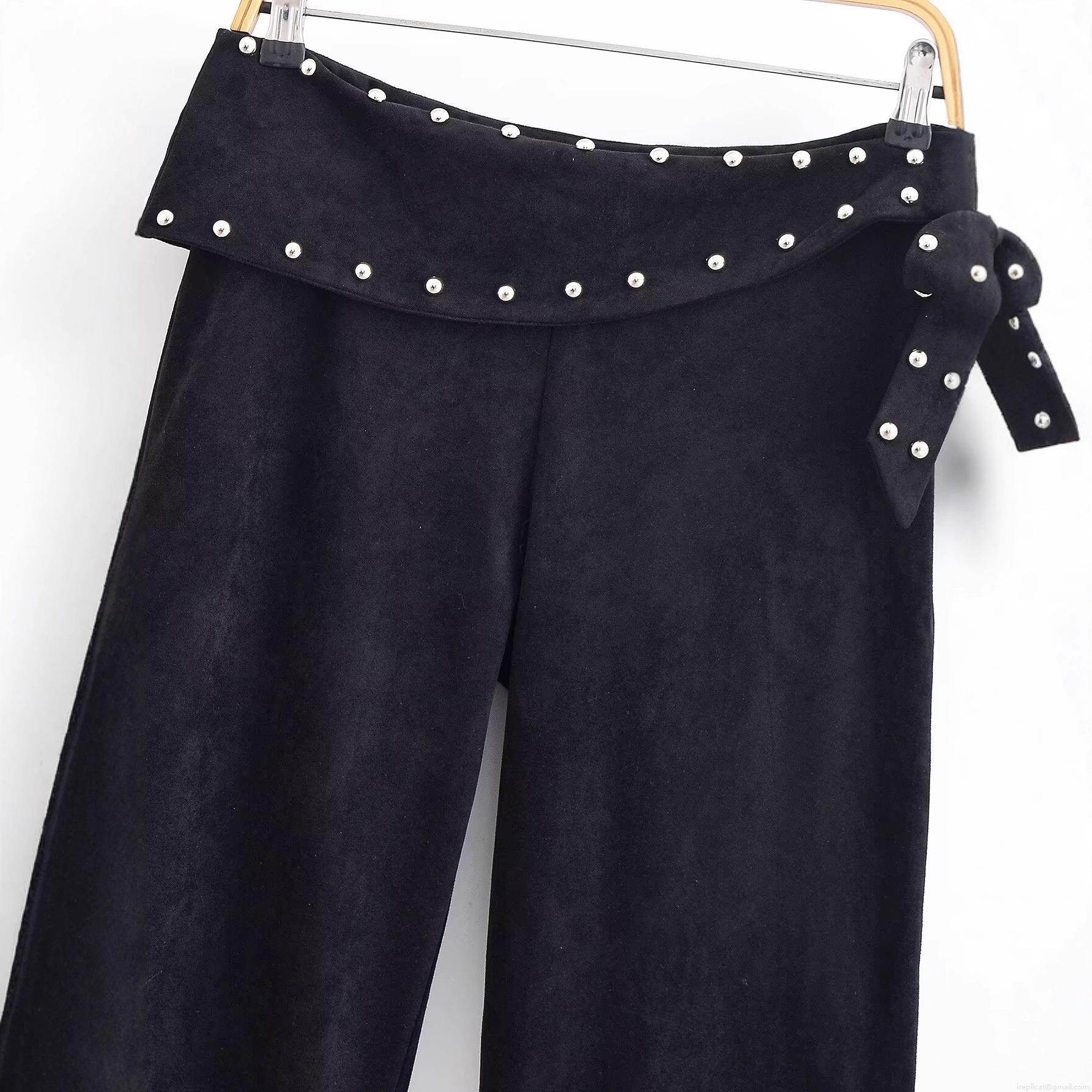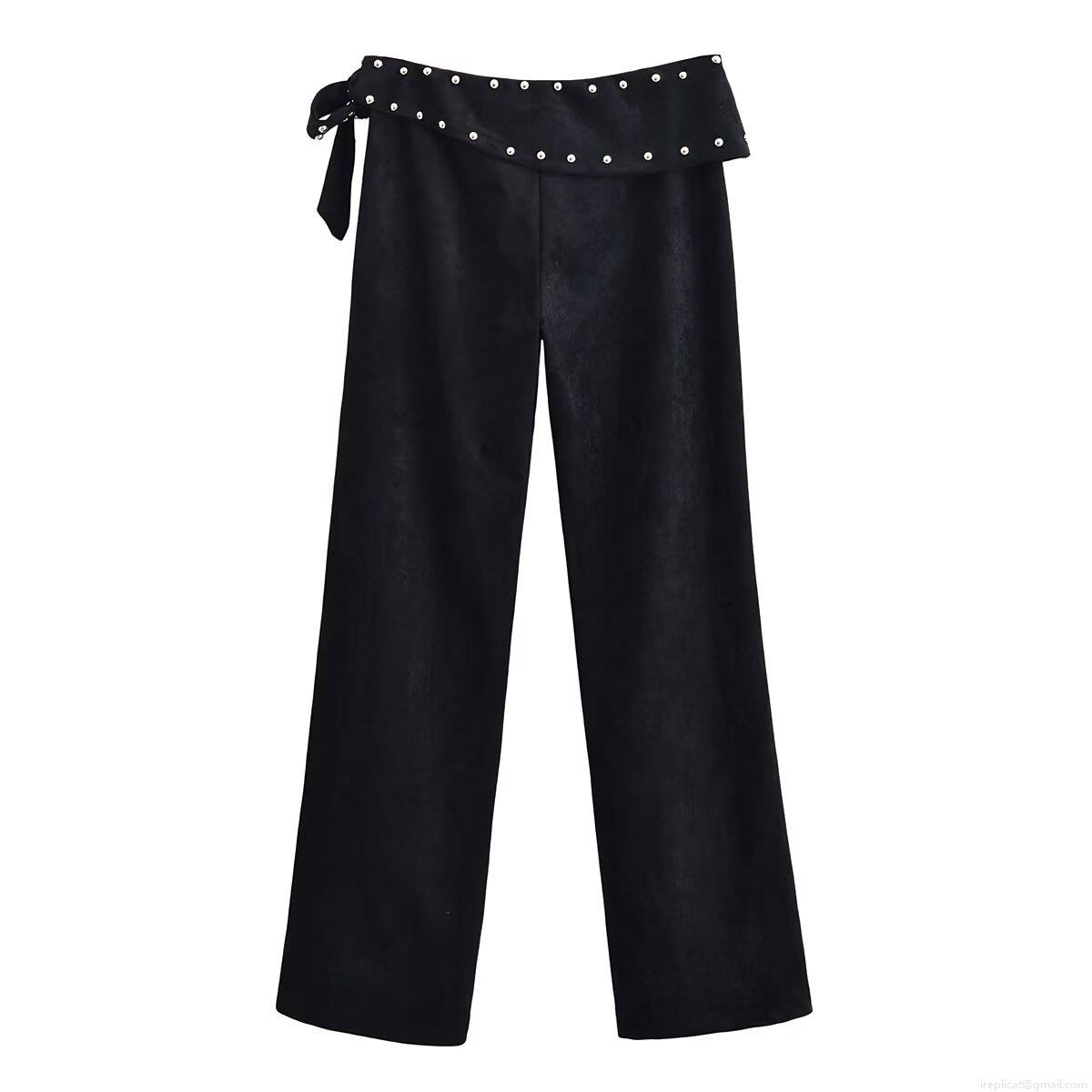 Women's Flare Pants Sueded Polyester Wide Leg Trousers With Rivet Studded Detail Side Bow Lace Up Casual Streetwear Black Autumn Winter Bottoms