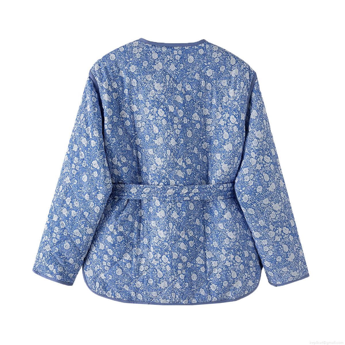 Women's Floral Quilted Jacket Polyester Cotton Padded Coat With Belt Long Sleeve Round Neck Single Breasted Mid Length Autumn Fashion Outerwear Blue Print