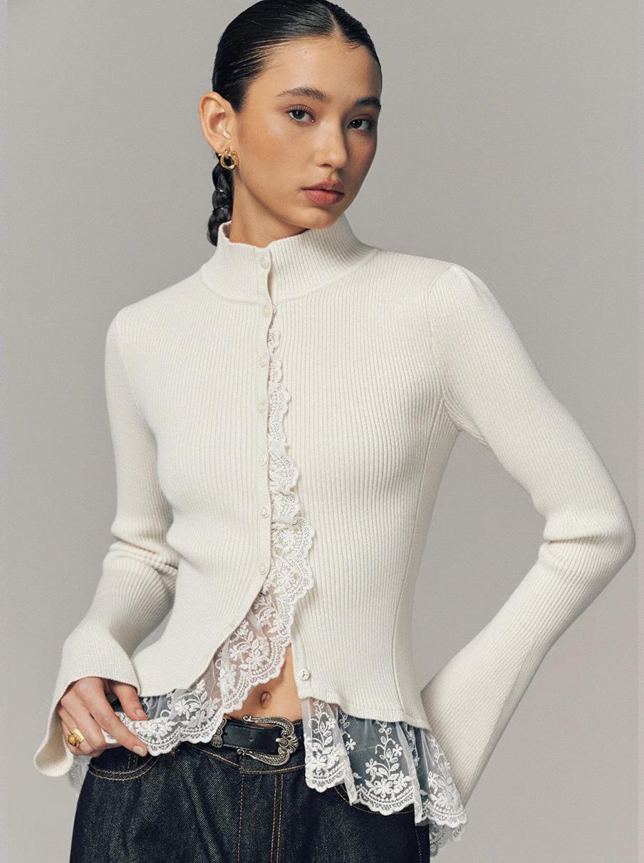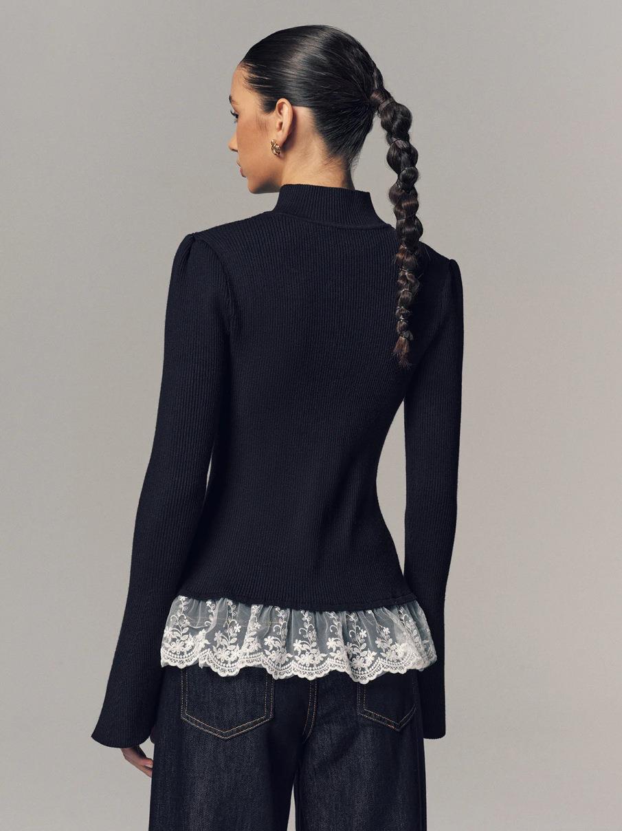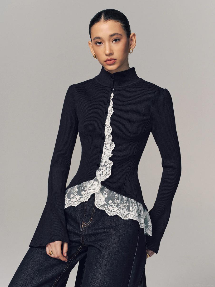 Women's French Elegant Slim Fit Knit Sweater Long Sleeve Ribbed Cardigan With Contrast Floral Lace Trim Base Shirt Top For Autumn Winter