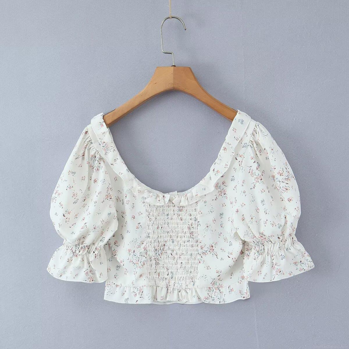 Women's French Floral Print Crop Top Sexy U Neck Puff Sleeve Button Front Ruffle Smocked T-Shirt Polyester Blend Summer Vacation Streetwear Tee Top for Ladies
